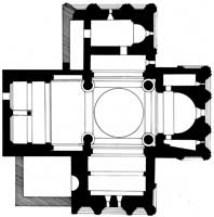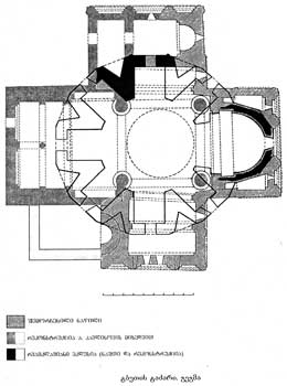მესამე ტაძრის გეგმას საფუძვლად დაედო ჯვარი ერთი აფსიდიანი (აღმოსავლეთის) და სამი მართკუთხა მკლავით. ვრცელი ცენტრალური კვადრატის კუთხეებში იდგა ოთხი მსხვილი გუმბათქვეშა ბურჯი. მათზე გადადიოდა ოდნავშეისრული თაღები. გუმბათქვეშა გარდამავალ კონსტრუქციას შერეული აფრულ-ტრომპული სახე ჰქონდა (ბურჯები, თაღები და გუმბათი ახლა ჩანგრეულია, მაგრამ კარგად ჩანს ა. პავლინოვის ფოტოსურათზე). სამხრეთის მკლავის სიგრძე მესამე ტაძარში დაახლოებით ახლანდელის ნახევარს შეადგენდა. ჩრდილოეთისა შიგნით იმავე სიგრძისა იყო, რაც დღესაა - ის მთავდრება რვამკლავიანი ეკლესიიდან შემორჩენილი ზემოთაღწერილი კედლით, მაგრამ გარედან ეს მკლავი დაგრძელებულია ზედ მიდგმული ეგვტერით, რომელიც მესამე ტაძარს არა ჰქონია, ის მოგვიანებით აშენდა. შესაბამისად, მესამე ტაძარს არც პატრონიკეები ჰქონდა განივ მკლავებში, იმდროს პატრონიკე მოწყობილი იყო მხოლოდ დასავლეთის მკლავში. შენობის ეს ნაწილი აღარ არსებობს და წარმოდგენა მის შესახებ მხოლოდ ძველ ავტორთა აღწერებით, ნახაზებითა და ერთი ფოტოსუართით შეიძლება შევიქმნათ.