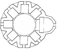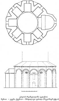 შემორჩენილი ფრაგმენტი საშუალებას გვაძლევს ზოგადად წარმოვიდგინოთ ნაგებობა, რომელსაც ის ეკუთვნოდა - ეს იყო ცენტრალური სტრუქტურა რადიალურად განლაგებული მკლავებით. მკლავების განლაგება უეჭველად მოწმობს, რომ მათი რიცხვი რვა უნდა ყოფილიყო. ამასვე ადასტურებს წახნაგების ურთიერთმიმართების კუთხეც - რვამკლავიანი ნაგებობა გარედან თექვსმეტწახნაგას უნდა წარმოადგენდეს, ხოლო რეგულარული თექვსმემტწახნაგას კუთხე სწორედ 157,5 გრადუსიანია, რაც შეესაბამება შემორჩენილი კუთხეების ზომას. სიგანე სამხრეთ-ჩრდილოეთ ღერძზე 18,5-19 მეტრს აღწევდა. რაც შეეხება აღმოსავლეთ-დასავლეთის ღერძს, საფიქრებელია, რომ აქ ძირითად პოლიგონალურ კორპუსს ემატებოდა ძლიერ შვერილი საკურთხევლის მოცულობა. როგორც ჩანს, ის ემთხვეოდა ახლანდელ აფსიდს და ბემას. ამგვარ რეკონსტრუქციას საფუძველს უმაგრებს ახლანდელი პასტოფორიუმების არასწორი კონფიგურაცია - მათი აფსიდთან მომიჯნავე კედლები ირიბად მიდის, თითქოს აფსიდის წრიული მოხაზულობის ანგარიშგაწევით. ეს კედლები, ალბათ, თავიდან წარმოადგენდა აფსიდის გარე კედლებს. შემდგომ, როცა გაკეთდა პასტოფორიუმები, ისინი ამ უკანასკნელთა ინტერიერში მოექცა.