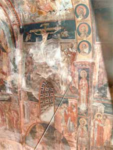 მრავალფიგურიანი კომპოზიციები, პილასტრების ერთიანი შევსება, სარკმლის წირთხლებისა თუ თაღის კუთხეებში ორნამენტული დეკორი, ბოლო რეგისტრის ფარდისებური მოტივი, რომელიც მთლიანად გასდევს კედლებს, ის დამახასიათებელი ნიშნებია, რომელიც უბისის კედლის მხატვრობაში გვხვდება. მთელს ეკლესიაზე გაბატონებულია კონქში გამოსახული ვედრების კომპოზიცია. ის თავისი მაშტაბურობით ტაძრის იდეურ და კომპოზიციურ ცენტრს წარმოადგენს. Eეს შთაბეჭდილება მიღწეულია საკონქო კომპოზიციის ვიზუალური გადიდებით. ვედრების სცენა მხოლოდ კონქს არ მოიცავს, ის მის ქუსლს ქვემოთაც საკმაოდ ჩამოდის. Aაქ დეისუსის გავრცობილი სახეა წარმოდგენილი. ტახტზე მჯდომი მაცხოვრის თავზე პირი ღვთისა გამოსახება. საკურთხევლის მომდევნო რეგისტრი სერობის კომპოზიციას ეთმობა_ ცენტრლური სცენა ტაბლასთან მსხდომ მაცხოვარსა და მის მოწაფეებს, ხოლო აქეთ-იქით პურითა და ღვინით ზიარებას. Mმესამე რეგისტრი წმ. Mმამათა რეგისტრია. რომელნიც გაშლილი გრაგნილებით ხელში ცენტრისაკენ (სარკმლისაკენ) მიემართებიან. სარკმლის წირთხლებში (რომელიც მამათა რეგისტრს ემთხვევა) გამოსახული ანგელოზნი სამწერობლებით ხელში კი უშუალოდ ამ საპროცესიო მსველობის წინამძღვრებად წარმოჩინდებიან.