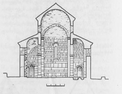 ტაძარში სამი შესასვლელია. პირველი სამშენებლო ფენიდან მხოლოდ სამხრეთის შესასვლელზეა შემორჩენილი არქიტრავის ქვის ჩამონატეხები და ნალისებრი ლუნეტის ნაშთი. ეკლესიის ინტერიერში ნავები ერთმანეთისგან გამოყოფილია ოთხი წყვილი, გეგმით ჯვრისებრი ბოძით. საკურთხევლის იატაკი ერთი საფეხურით იყო ამაღლებული. შუა ნავის სამხრეთ ბოძების რიგმა და მათზე გდაყვანილმა თაღებმა პირვანდელი სახით მოაღწია. თაღების მარტივ პროფილიანი იმპოსტები მთლიან ოთხკუთხა ქვაშია გამოკვეთილი, ბაზისები კი კუბურია. ეკლესიის სახურავი კრამიტისაა. ტაძარს სამხრეთით და ჩრდილოეთით მინაშენები ჰქონდა. სამხრეთის მინაშენი, რომელიც აღმოსავლეთით ეგვტერით მთავრდება, პირვანდელი ნაგებობის თანადროულია. მინაშენების დანარჩენი ნაწილი გვიანდელია.
