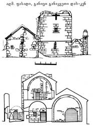 ა) ორსართულიანი კოშკური ეკლესია (6,5X6 მ) ნაგებია თლილი ქვის ფილებით. ორივე სართულს შესასვლელი დასავლეთიდან, ეგვტერიდან აქვს. პირველ სართულზე აღმოსავლეთით სარკმელი და ორი ნიშია, ჩრდილოეთით - სარკმელი და ნიში. მეორე სართული მომრგვალებულაფსიდიანი პატარა ეკლესიაა. აფსიდის ჩრდილოეთით სამკვეთლოა, ხოლო სამხრეთით-ღრმა ნიში. საკურთხეველში და ეკლესიის ჩრდილოეთ და სამხრეთ კედლებში თითო სარკმელია. სამხრეთ-დასავლეთ კუთხეში მიშენებული ვიწრო კიბე ბანზე ადის. დარბაზის გრძივ კედლებში თითო ნიშია. ჩრდილოეთ კედლის ნიში პატარაა და აღმოსავლეთ კუთხესთანაა, ხოლო სამხრეთის ფართო და ღრმა ნიშს კედლის შუა ნაწილი უჭირავს.
