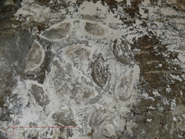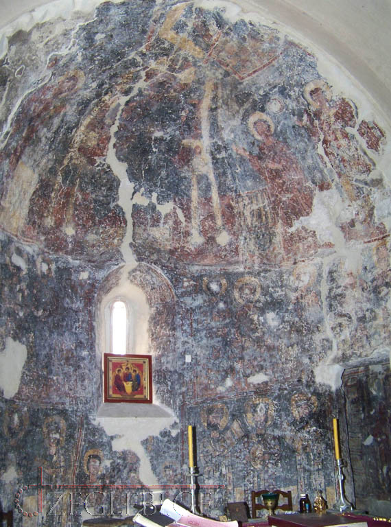 დარბაზული ეკლესიის აფსიდში და მის სამხრეთ-აღმოსავლეთ სათავსებში გადარჩა მოხატულობის ფრაგმენტები. აფსიდის კონქის ჩრდილოეთის მხარეს გაირჩევა მოწითალო მიწა მთავარანგელოზის ტანსაცმლის ნაწილი, მეორე რეგისტრში - ორნამენტული ზოლი და წმინდანის გამოსახულება. სამხრეთ-აღმოსავლეთ სათავსი მთლიანად მოხატულია. სარკმელს გვერდებზე უხეში ორნამენტი გასდევს. სარკმლის ქვემოთ წმინდა მეომრის ფიგურაა, სამხრეთ კედელზე გამოსახულია ტახტზე მჯდომი ღვთისმშობელი ჩვილით, ღვთისმშობლის თავთან ორი ანთებული სანთელია; კომპოზიციის მარჯვენა ზედა კუთხეში მედალიონში ჩასმული ფიგურისაგან მხოლოდ კურთხევის გამომსახველი ხელია შემორჩენილი; მედალიონის ქვემოთ გამოსახულია ღვთისმშობლისაკენ მიბრუნებული საერო პირი;