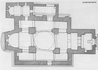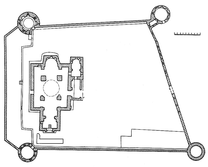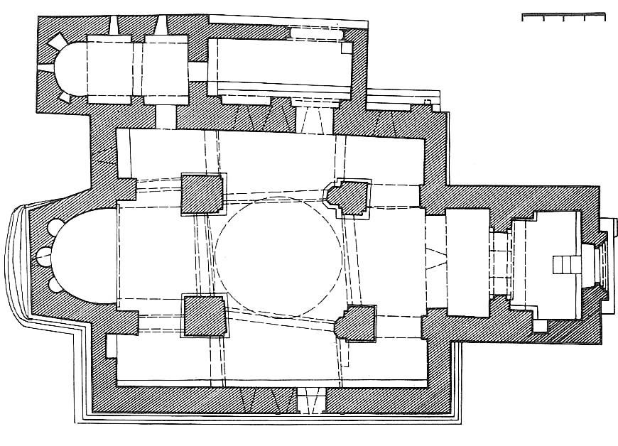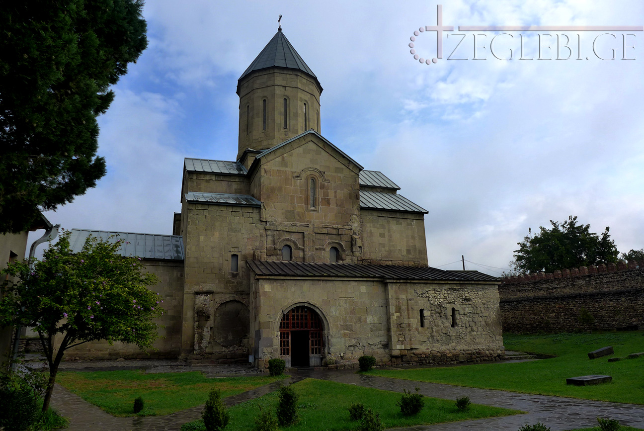 ა) ღვთისმშობლის ტაძარი ცენტრ-გუმბათოვანი ნაგებობაა (28X24 მ). ნაშენია ქვიშაქვის თლილი კვადრებით. ინტერიერის და ნაწილობრივ დარბაზული ეკლესიის სამხრეთ ფასადის კედლების წყობაში გამოყენებულია რიყის ქვა, აგური და ორნამენტიანი კვადრები, რომლებიც მოგვიანებით, გადაკეთებისა და შეკეთების დროსაა ჩასმული. ტაძარს სამხრეთითა და დასავლეთით კარიბჭეები ეკვრის. მესამე შესასვლელი ჩრდილოეთითაა (კარი ამოლუქული იყო; ბოლო შეკეთების დროს გახსნეს). აღმოსავლეთით ღრმა ნახევარწრიული აფსიდია. გუმბათის ყელი ოთხ თავისუფლად მდგომ ბურჯს ეყრდნობა. გუმბათის ყელზე გადასვლა ხდება აფრების მეშვეობით. გუმბათში 12 სარკმელია. გარდა ამისა, ინტერიერს კიდევ 10 სარკმელი აშუქებს: ორი აღმოსავლეთითაა – აფსიდში და სამხრეთის ნავში, ერთი დასავლეთ კედელშია, სამ-სამი ჩრდილოეთსა და ოთხი სამხრეთის კედლებში. საკურთხევლის ქვეშ და მის ორივე მხარეს საკმაოდ მაღალი ნიშებია. აფსიდის კუთხეებთან ღრმად შეწეული პილასტრებს ორნამენტით მორთული სატრიუმფო თაღი და გუმბათქვეშა ბოძებისაკენ გადაყვანილი თაღები ეყრდნობა. ჩრდილოეთისა და სამხრეთის ვიწრო ნავებს აღმოსავლეთით სწორი კედლები აქვს. დასავლეთის აგურისთაღიან გასასვლელთან ბაზილიკის დროინდელი სამიარუსიანი და ორნამენტიანი პილასტრებია. დასავლეთის კარიბჭესა და დარბაზს შორის მცირე სწორკუთხა სათავსია. ამ სათავსიდან კარიბჭეში გასასვლელი თაღოვანია; თაღი ღრმად შეწეულ პილასტრებს ეყრდნობა. დასავლეთის მხარეს იატაკის დონე ბევრად მაღალია, ვიდრე კარიბჭესა და დარბაზში, ამიტომაც კარიბჭის წინ ჩასასვლელი ქვის კიბეა.