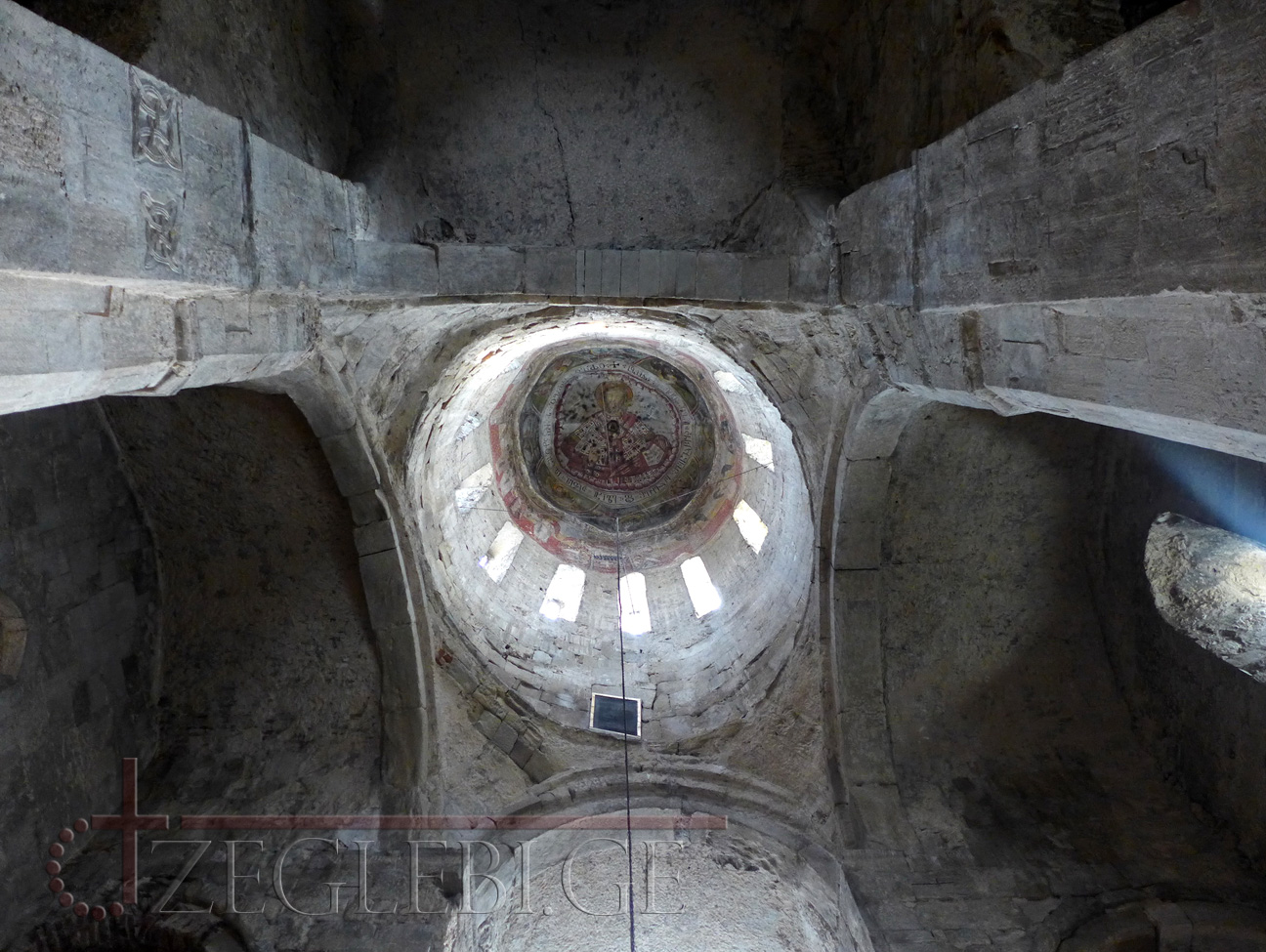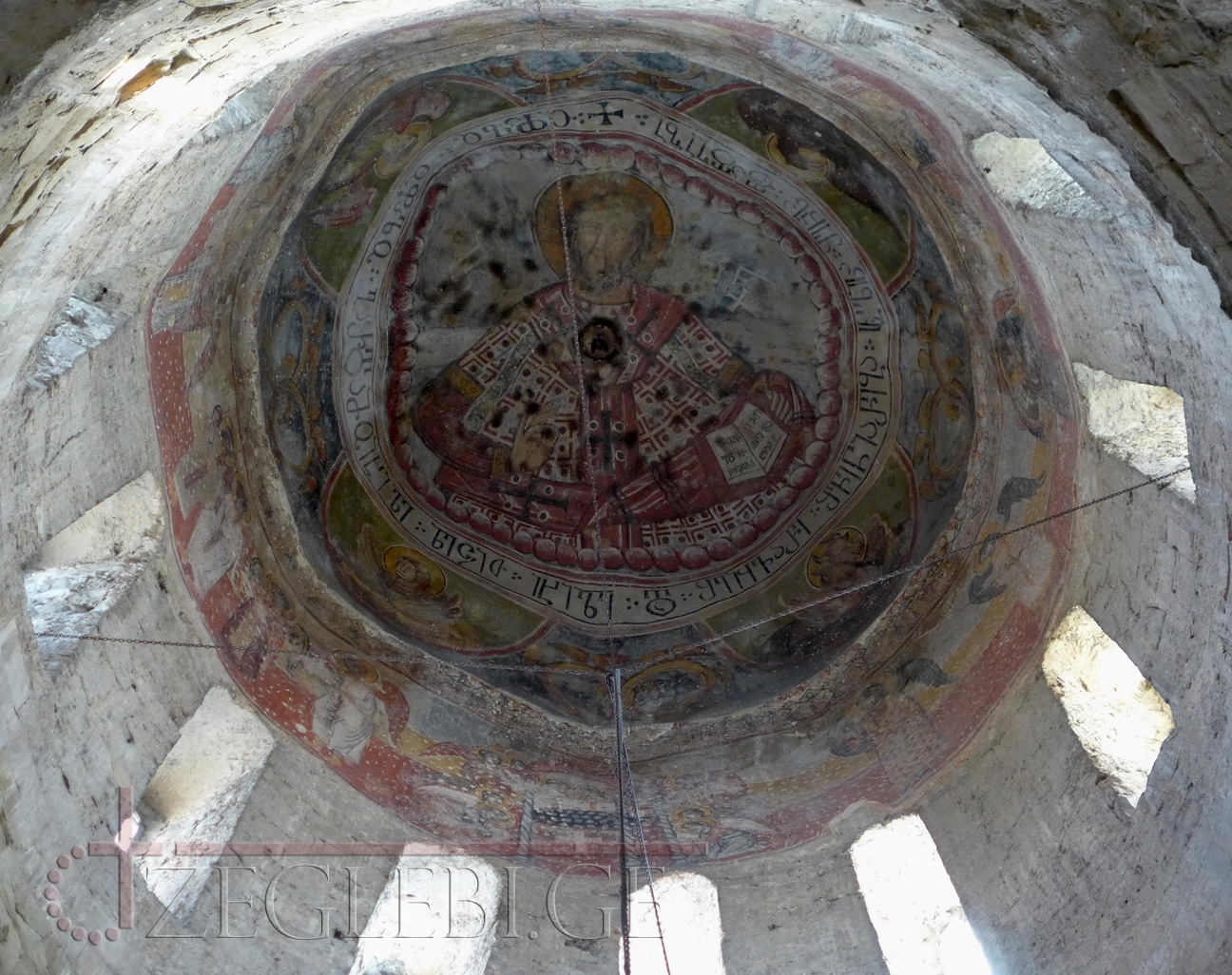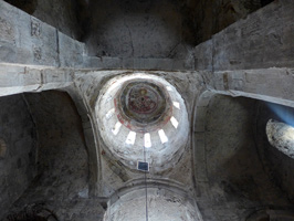 XVI-XVII საუკუნეების მოხატულობა შემორჩენილია მხოლოდ გუმბათში: ცენტრში, ორმაგ წრეში გამოსახულია ქრისტე, რომელიც მარჯვენა ხელით აკურთხებს, ხოლო მარცხენაში გადაშლილი სახარება უჭირავს. ორმაგ წრეში აომთავრული წარწერაა. ცენტრალურ წრის გარშემო ოთხ ნახევარწრეში მოგვიანო ხანაში გადაწერილი მახარებელთა სიმბოლოებია; მახარობელთა შორის ექვსფრთდედებია. შემდეგ რეგისტრში, გუმბათის ყელის ზედა ნაწილში, გამოსახულია ანგელოზებით გარშემორტყმული კიბორიუმი. მხატვრობა შესრულებულია ბაცი შინდისფერი, მოწითალო, ყვითელი და ლურჯი ფერებით. გამოსახულებანი პატარა ზომისაა, ნახატი – უხეში.