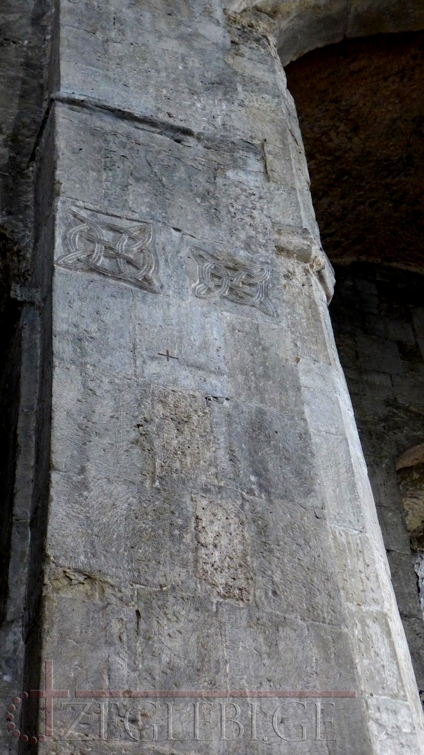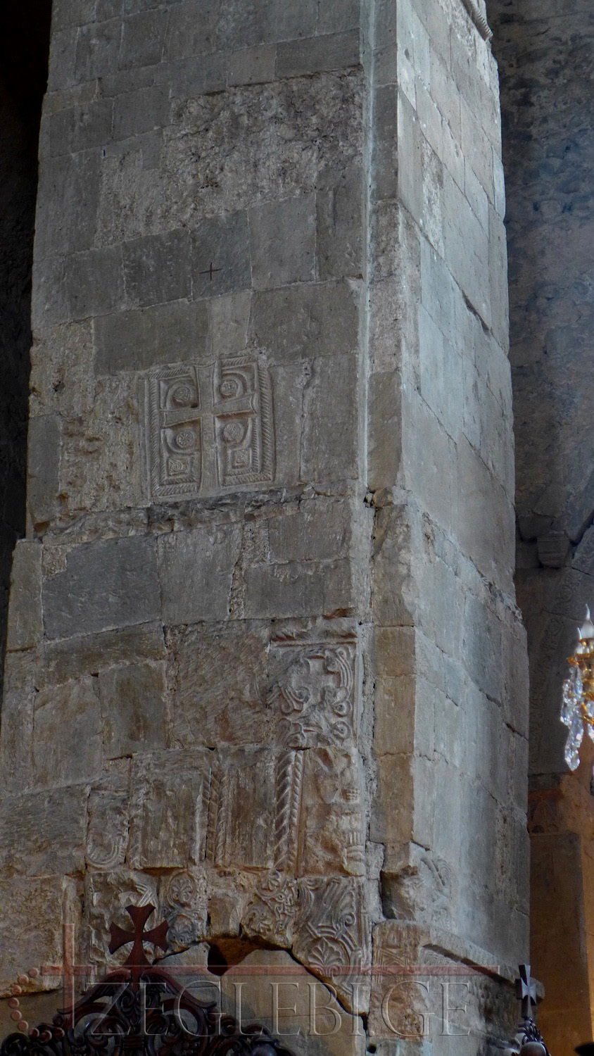 სამხრეთის კარიბჭე მართკუთხაა. მის დასავლეთ ნაწილში, ტაძრის კარის პირდაპირ, განიერი თაღოვანი შესასვლელია. კარიბჭეს აღმოსავლეთით ეკვრის მცირე ზომის დარბაზული ეკლესია, რომელიც კარით უკავშირდება როგორც კარიბჭეს, ისე ტაძრის სამხრეთ ნავს. დარბაზულ ეკლესიას აღმოსავლეთით ნახევარწრიული აფსიდი აქვს, აფსიდში ერთი სარკმელი და ორი მცირე ნიშია. დარბაზის ჩრდილოეთსა და სამხრეთის კედლების პილასტრებს ნახევარწრიული კამარის საბჯენი თაღი და კედლის თაღები ეყრდნობა.სამხრეთი კედლის თაღის წინაპირზე შემორჩენილია გრაფიკულად ამოკვეთილი ორნამენტი. სამხრეთის კედლის თაღებში სარკმლებია გაჭრილი. ტაძარში გასასვლელი კარი გადახურულია მოზრდილი არქიტრავით, რომლის შუა არეში, წრეში ამოკვეთილია აჟურული ჯვარი. ტაძრის ჯვრის მოყვანილობის მკლავებშორისი ნაწილები თავიდან ბოლომდე გახსნილია. გუმბათქვეშა თაღების ხაზი ოდნავ შეისრული და მრუდია. ინტერიერში სატრიუმფო თაღი, გუმბათქვეშა ბოძებისა და პილასტრების ყოველი იარუსის კაპიტელები მორთულია სხვადასხვა დროის ორნამენტებით. გარდა ამისა, ორნამენტიანი კვადრები და ფრაგმენტები გამოყენებულია გუმბათქვეშა ბოძებისა და კედლების წყობაში საშენ მასალად.