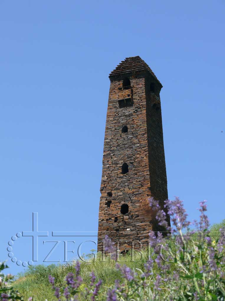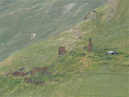 I.კოშკი(დათოს-ციხე) დგას ნასოფლარის განაპირას, ჩრდილოეთით. ხუთსართულიანია. ფუძეში 5.6X5.3მ-ია, ხოლო ზემოთკენ ვიწროვდება. ნაგებია ფიქალი ქვით, წყობა მშრალია. დაზიანებულია, ჩამონგრეულია სართულშუა გადახურვა (შემორჩენილია კედელებიდან გამოწეული ფიქლის ფილები, რომლებზეც კოჭები იყო გადებული). შესასვლელი I სართულზეა, სამხრეთიდან. კარი თაღოვანია. სართულის აღმოსავლეთ და ჩრდილო კედლების კიდეებში თითო სათოფურია. II სართულის ჩრდილოეთ კედელში ორი კვადრატული სათოფურია, აღმოსავლეთ და დასავლეთ კედელში თითო-თითო. სამხრეთ კედელში შეისრულთაღოვანი სარკმელია. III და IV სართულებსაც თითო სარკმელი აქვთ სამხრეთ კედლებზე. III სართულის აღმოსავლეთ და დასავლეთ კედლებზე თითო სათოფური აქვს. IV სართულის აღმოსავლეთ და დასავლეთ კედლებზე ორ-ორი სათოფურია, ჩრდილოეთ კედელში კი ერთი. V სართულის ოთხივე კედელში თითო მაღალი შეისრულთაღოვანი სარკმელია, რომელთა ქვედა ნახევარზე, გარედან, ფიქლის სამ-სამ კონსოლზე დაყრდნობილი სწორკუთხა მაშიკულია მიდგმული. კოშკის ოთხივე ფასადზე, მაშიკულების ოდნავ ქვემოთ, ჭადრაკულად განლაგებული მცირე ზომის კვადრატული ნიშებით ორ-ორი პატარა რომბია გამოყვანილი. კოშკს საფეხურებიანი, პირამიდისებრი გადახურვა აქვს. II.ციხე-სახლი დგას ნასოფლარის განაპირას, ჩრდილო-დასავლეთით. აგებულია XVIII საუკუნეში. ციხე-სახლი (6.5X6.8მ) ხუთსართულიანია. აღმოსავლეთიდან ეკვრის გვიანდელი მინაშენი. ორივე ნაგებობა ფიქლითაა ნაშენი. ციხე-სახლის II და III სართულები შიგნიდან მიწანარევი ნაკელითაა შელესილი. დაზიანებულია: ჩამონგრეულია ციხე-სახლის V სართულის კედლების ზედა ნაწილები და სართულშუა გადახურვა. დანგრეულია მინაშენის უმეტესი ნაწილი.