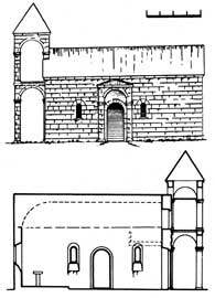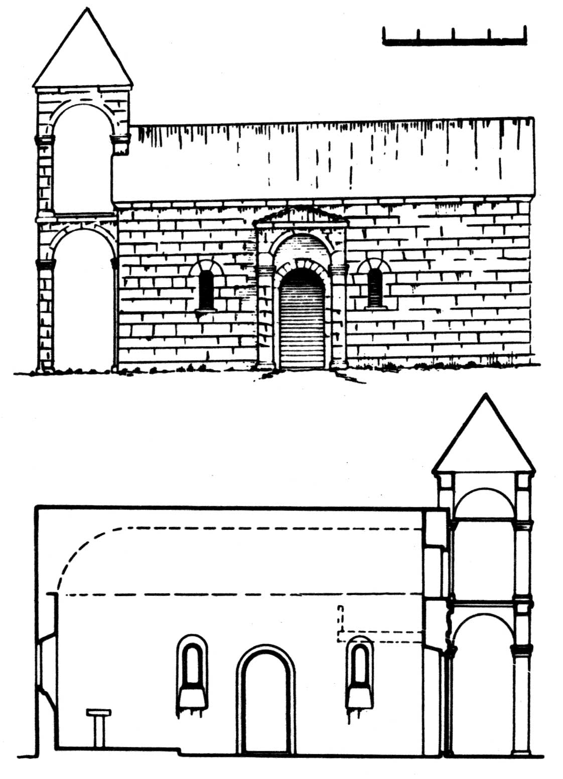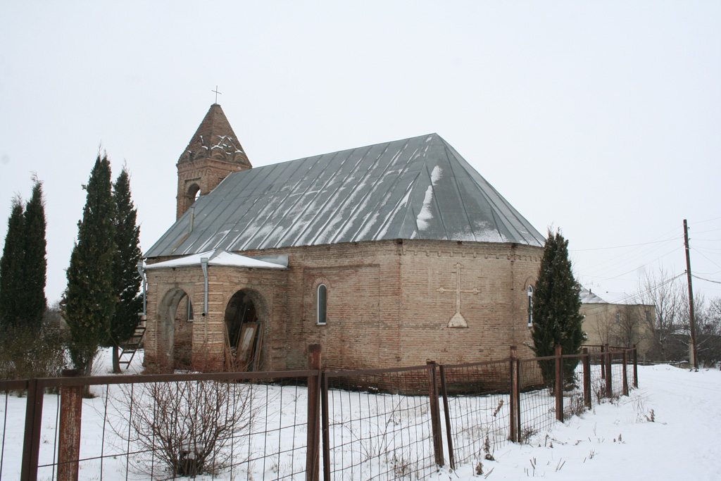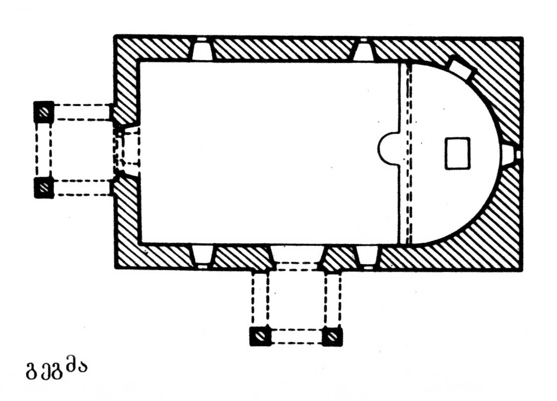 ა) ეკლესია დარბაზულია (17,5X5,7 მ), ნაგებია აგურით. შესასვლელები სამხრეთიდან და დასავლეთიდან აქვს. აღმოსავლეთით სამწახნაგოვანი შვერილი აფსიდია. აფსიდის შუა წახნაგში თაღოვანი სარკმელია, ხოლო გვერდით წახნაგებში- თითო მაღალი თაღოვანი ნიში. ერთი თაღოვანი ნიში ეკლესიის ჩრდილოეთ კედლის აღმოსავლეთ ნაწილშია. დარბაზის გრძივ კედლებში ორ-ორი სარკმელია. ნიში და სარკმლები ერთ დონეზეა და ერთნაირია. საკურთხევლის საფეხურით ამაღლებული ბაქანი ტავისი არდაბაგით მიახლოებულია დარბაზის გრძივი კედლების პილასტრების აღმოსავლეთ წყვილთან. გრძივი კედლები ორი წყვილი მარტივი პილასტრით დაყოფილია სამ არათანაბარ ნაწილად, რომელთაგან აღმოსავლეთისა დანარჩენებზე რამდენადმე დიდია.ამ პილასტრებს კამარის საყრდენი თაღები ეყრდნობა. დასავლეთით პატრონიკეა, რომლის ჩრდილო-დასავლეთ კუთხეში არსებული ხის კიბით ერთის მხრივ დარბაზს უკავშირდება, ხოლო მეორეს მხრივ დასავლეთ კედელში გაჭრილი კარით-სამრეკლოს მეორე სართულს. ინტერიერი და ფასადები შელესილი და შეთეთრებულია.