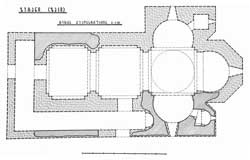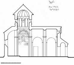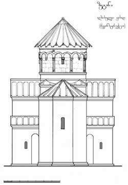 მოხაზულობა აქვთ, ხოლო კონქებისა და დასავლეთი მკლავის მომსაზღვრელი თაღები ოდნავ შეისრული ფორმისაა. მცირე ზომის პასტოფორიუმებში შესასვლელები გვერდითი აფსიდების აღმოსავლეთ კედლებშია გაჭრილი. აფსიდი ერთი დამატებითი თაღით არის დაგრძელებული. `ტრიკონქი~ და დასავლეთი მკლავი ერთმანეთისაგან დამატებით საფეხურად აღმართული პილასტრებით გამოიმიჯნება. სწორკუთხა მკლავი განივ კედლებზე დადებული სამსაფეხურიანი პილასტრ-თაღების მეშვეობით ორ ნაწილად იყოფა, რომელთაგან დასავლეთისა უფრო მოკლეა. დასავლეთის მკლავს სამხრეთ-დასავლეთით ვიწრო და გრძელი გალერეა-გარშემოსავლელი ერტყმის, რომლის სამხრეთი მონაკვეთი აღმოსავლეთით აფსიდით სრულდება. ტაძარში შესასვლელი ორივე კარი დასავლეთ მკლავშია გაჭრილი (დასავლეთ კედელში და სამხრეთ კედლის აღმოსავლეთ კიდეში). ტაძარში მოხვედრა მხოლოდ გალერეა-გარშემოსასვლელის გავლითაა შესაძლებელი. ინტერიერი რვა სარკმლით ნათდება, მათგან თითო-თითო მკლავებშია გაჭრილი, ოთხი კი გუმბათის ყელში. გუმბათის აღმოსავლეთისა და დასავლეთის სარკმლები მოგრძოა, სამხრეთისა და ჩრდილოეთისა კი წრიული. გუმბათის სფეროს ძირში გაჭრილია კიდევ ერთი, მცირე ზომის წრიული სარკმელი. პასტოფორიუმები ნათდება თითო სარკმლით აღმოსავლეთ მხარეს, ხოლო სამხრეთ პასტოფორიუმს სამხრეთით კიდევ ერთი მცირე ზომის წრიული სარკმელი აქვს. იატაკი გათლილი ქვის უნდა ყოფილიყო, სოლეა კი ერთი საფეხურით ამაღლებული.