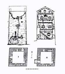 ბ) კოშკი (8X7.6 მ) სასახლის აღმოსავლეთითაა 20-25 მეტრზე, ნაგებია რიყის ქვით. შესასვლელი I სართულზეა ჩრდილოეთიდან. ამ IV სართულზე თითო სარკმელია, ხოლო III-ზე - ორი. ყოველ სართულზე თითო თაღოვანი ბუხარი და ოთხი-ექვსი სათოფურია, რომლებსაც გადახურვა და ძირი ჰორიზონტალური აქვს. სართულშუა გადახურვა ხის ყოფილა, ორმაგი. კოჭების საყრდენ ბუდეებში შემორჩენილია მათი დანახშირებული ნაწილების ბოლოები. I, II და III სართულები ერთმანეთს უკავშირდებოდა კედლებს აყოლებული ქვის კიბით, ხოლო IV სართულს - ხის მიდგმული კიბით. კოშკი შიგნით და გარედან შელესილია. გადახურული ყოფილა ორფერდა სახურავით. არქეოლოგიური დაზვერვების დროს აიკრიფა შორენკეცებისა და კრამიტის ნამტვრევები.