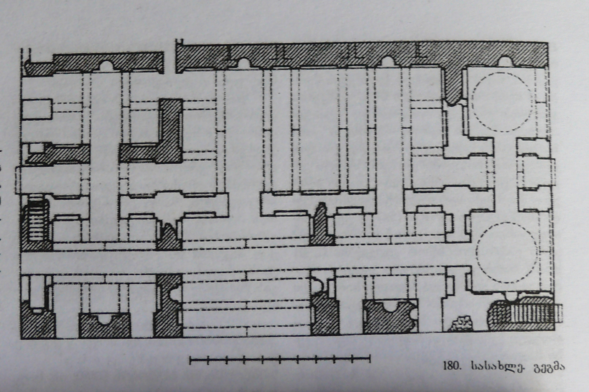 ა) სასახლე გეგმით სწორკუთხაა (30 X 17 მ). ნაგებიაძირითადად აგურით. წყობაში გამოყენებულია რიყის ქვაც, რომლის რიგები აქა-იქ ენაცვლება აგურისას. კამარები და საბჯენი თაღები მთლიანად აგურით ყოფილა ნაწყობი. შემორჩენილია მხოლოდ I სართულის კედლების ნაწილები. სადგომები ორ მწკრივადაა განლაგებული. წინა მწკრივში ოთხი ოთახია, უკანაში - სამი. წინა მწკრივის ოთახები ბევრად უფრო ღრმაა. ოთხივეს გრძივი ღერძი მართობულია შენობის გრძივი ღერძისა. უკანა მწკრივის ოთახებიდან შუა ძლიერ დაგრძელებულია შენობის გრძივი ღერძის გასწრივ, განაპირა ოთახები კი, თითქმის კვადრატულია. ყველა ოთახში ბუხარი და შეისრულთაღიანი ორსართულიანი ნიშებია. შემორჩენილია შეისრული საბჯენი თაღების ნაწილები. საბჯენი თაღები ორივე მწკრივის გრძელ დარბაზებში ერთმანეთისაგან არათანაბარი მანძილითაა დაშორებული, რომელთაგანაც განაპირებს, განივი კედლებიდან გადმოყვანილი ორ-ორი პერპენდიკულარი საბჯენი თაღი ერყწმის. კედლების ზედაპირის დამუშავება-მორთულობის არავითარი კვალი აღარ ჩანს. შენობის უკანა მწკრივის შუა ოთახის ჩრდილოეთ კედლის აღმოსავლეთ ნახევარზე და აღმოსავლეთ კედელზე, კამარებს ზემოთ, შემორჩენილია რიყის ქვის სრულიად დაუმუშავებელი კედელი (სიმ. 1,7 მ). იგი ალბათ სხვენს ეკუთვნოდა.