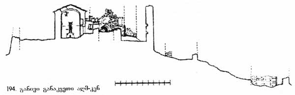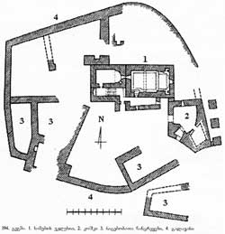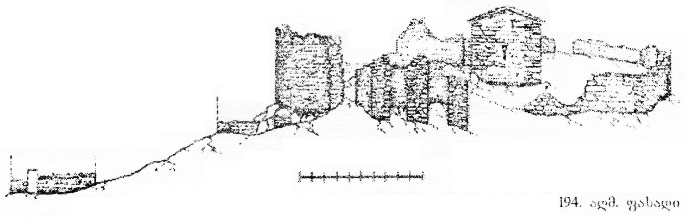 დ) კოშკთან ახლოს ნანგრევებად ქცეული ორი სწორკუთხა ნაგებობაა. კომპლექსის დანარჩენ ნაგებობათაგან მხოლოდ კვალია შემორჩენილი.