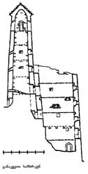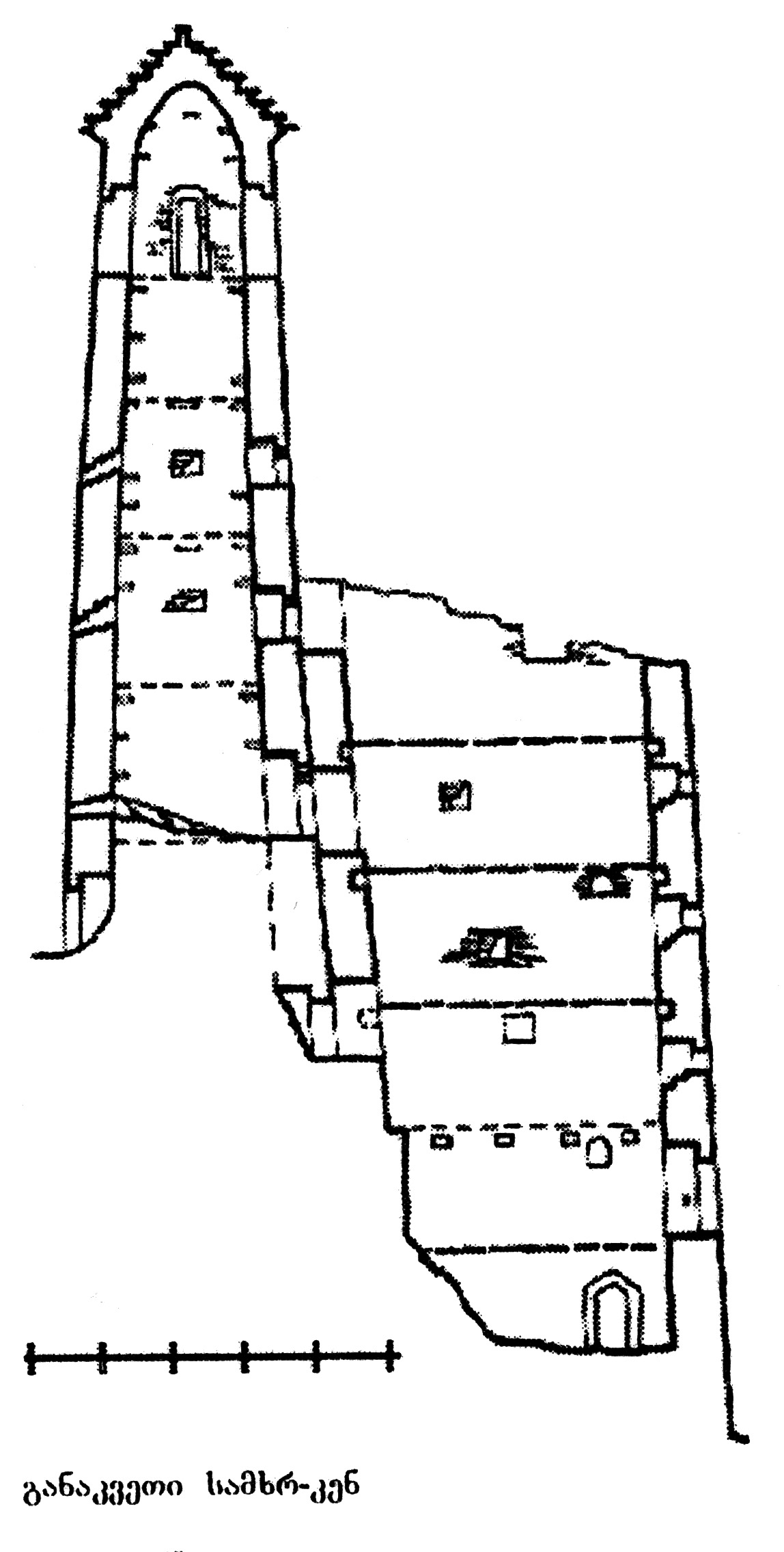 ბ) ციხე-სახლი ექვსსართულიანი ყოფილა და გეგმით ტრაპეციისმაგვარია (6,6X5,4 მ). შესასვლელი პირველ სართულზე აღმოსავლეთიდანაა, მეორე, მესამე და მეოთხე სართულებზე - დასავლეთიდან. ყოველ სართულზე (გარდა პირველისა) სათოფურებს სარკმლები სჭარბობს. სამხრეთ კედელში ორ-ორი სარკმელია. მეოთხე სართულის ოთხივე კედელში თითო დიდ ხვრელობია, რომლებზედაც გარედან სალოდეა მიოდგმული. სართულშუა გადახურვა ხის კოჭებზე ყოფილა გამართული.