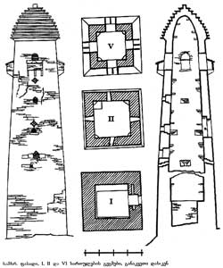 ა) კოშკი გეგმით კვადრატულია (4,1X4,1 მ), შევიდსართულიანი. ქვედა სამ სართულს თოთო თაღოვანი შესასვლელი აქვს. პირველ და მესამე სართულებს სამხრეთიდან, მეორე სართულს - ჩრდილოეთიდან. კოშკის პირველი სართულის კარი ციხე-სახლის მესამე სართულზე გადის, მესამე სართულისა კი ციხე-სახლის მეხუთე სართულზე. ყველა სართულზე (ბოლოს გარდა), ყოველ კედელში ორ-ორი სათოფურია. ციხე-სახლის მხარეს სათოფურები ამოქოლილია. ბოლო სართულის ოთხივე კედელში თითო განიერი და მაღალი ღიობია. კოშკის სართულშუა გადახურვები ხის კოჭებზე ყოფილა გამართული, რომლებიც ბოლოებით კუთხეების წყობაში ირიბად ჩასმულ ქვის ფილებს ეყრდნობოდნენ. ბოლო სართული შეკრული კამარითაა გადახურული. კოშკს საფეხუროვანი პირამიდული ფორმის სახურავი აქვს.