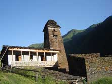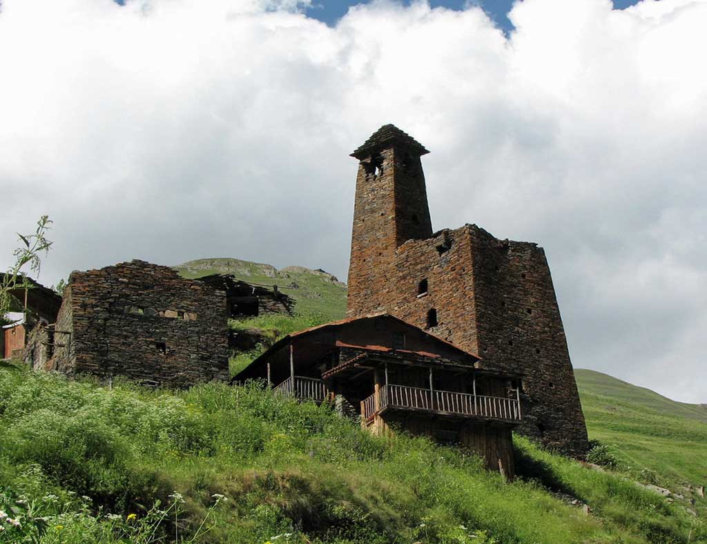 ბ) პირველი ექვსსართულიანი ციხე-სახლის – “ციხის”, მეორენაირად – “სასოფლო ციხის” (7.5X6.2მ, შემორჩენილი სიმაღლე 14.2მ) I, II და III სართულებზე შესასვლელი ჩრდილო-დასავლეთიდანაა, IV-ზე ჩრდილო-აღმოსავლეთიდან. კარი ორ სალოდეს შორისაა. სამხრეთ-აღმოსავლეთ კედელში დიდი ღიობია, დანარჩენ კედლებში – ორ-ორი ორმაგი სალოდე. Gგადახურვა მხოლოდ I და II სართულებს შემორჩა, იგი ხის კოჭებზეა გამართული.