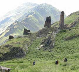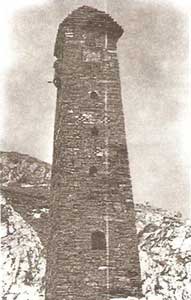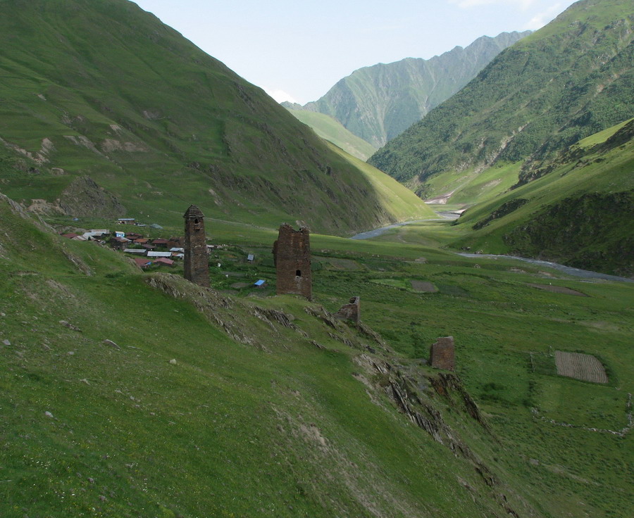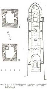 I. კოშკი დგას სოფლის დასავლეთით ნახევარ კილომეტრში, კლდეზე. იგი ხუთსართულიანია (4.2X3.9 მ, სიმაღლე 18.3მ), ზემოთკენ შევიწროვებული. ნაგებია ფიქლით. წყობა მშრალია. I სართულის ჭერი კამაროვანი გადახურვითაა, დანარჩენი სართულების გადახურვა ბრტყელი იყო და ხის კოჭებს ეყრდნობოდა. შესასვლელი სამხრეთიდანაა I სართულზე, მიწიდან 2.1 მ სიმაღლეზე. კარი ბრტყელი თაღითაა გადახურული. დანარჩენ კედლებში თითო სათოფურია. I სართულის ქვემოთ ყრუკედლებიანი დაბალი (1.4 მ) სათავსია. I სართულის კამაროვან ჭერში გაკეთებულია II სართულზე ასასვლელი ხვრელი. II სართულის სამხრეთ კედელში სარკმელია, დანარჩენ კედლებში – თითო სათოფური. III და IV სართულები II-ს ანალოგიურია. V სართულს ყოველ მხარეს, ქვის კონსოლზე დაყრდნობილი თითო სწორკუთხა მაშიკული აქვს, რომელთა ზემოთ შეისრულთაღოვანი სარკმელი “სამზირი” აქვს. კოშკის ოთხივე ფასადზე, III და IV სართულის დონეზე, ჭადრაკულად განლაგებული კვადრატული ნიშნებით გამოყვანილი პატარა რომბებია. სამხრეთ ფასადზე სამი ასეთი რომბია, დანარჩენ კედლებზე ოთხ-ოთხი. კოშკს საფეხურებიანი პირამიდული გადახურვა აქვს.