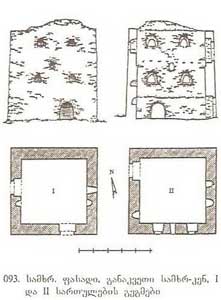 ა) კოშკი (6.5X6.5 მ) ოთხსართულიანი, შემორჩენილია სამი სართული და მეოთხეს დასწყისი. I სართულზე სამხრეთ და დასავლეთ კედლებზე ფართო თაღოვანი კარია. აღმოსავლეთ კარის ღერძზე გარეთკენ შევიწროვებული თაღოვანი სარკმელია, რომლის სამხრეთით თაღოვანი ნიშია. ასეთივე ნიშია დასავლეთ კედელშიც, კარის მარცხნივ. II სართულის ჩრდილოეთ კედლის დასავლეთ კიდეში თაღოვანი კარია გაჭრილი. ამავე კედლის სამხრეთ კიდეში პატარა თაღოვანი ნიშია. ორი ნიშია აღმოსავლეთ კედელში. სამი სარკმელია სამხრეთ კედელში. ერთ დონეზე განლაგებული კიდურა სარკმელები თაღოვანია, ხოლო მესამე, შუა სარკმელი, მათ ზემოთაა მოქცეული და მართკუთხაა. III სართულის თაღოვანი კარი დასავლეთ კედელშია გაჭრილი. ამ სართულის სამხრეთ კედელში ორი თაღოვანი სარკმელია, აღმოსავლეთ კედელში – ერთი. ჩრდილოეთ კედელში გაჭრილი სარკმელი სწორკუთხაა.