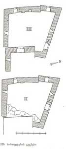 ბ) აღმოსავლეთის კოშკი: მხოლოდ აღმოსავლეთ და ჩრდილოეთ კედლების ნაშთებია შემორჩენილი. I სართული დასავლეთ კოშკის II სართულს უსწორდება. იგი მთლიანად მიწითაა ამოვსებული. II სართულის აღმოსავლეთ კედლის ღერძზე, გაჭრილია თაღოვანი კარი, ჩრდილოეთ კედელში თაღოვანი სათოფურია.