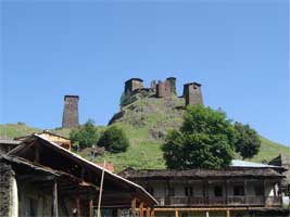 ა) ზედა კოშკი (4,8X4,2 მ) ოთხსართულიანია (შემორჩენილი სიმაღლე 9,3 მეტრია). პირველ სართულზე შესასვლელი ჩრდილოეთიდანაა, მეორე სართულზე - დასავლეთიდან. მეორე სართულზე კედლები შიგნიდან მიწანარევი ნაკელითაა შელესილი. ჩრდილოეთ კედელში ერთი სათოფურია, აღმოსავლეთისაში - ორი სათოფური და ერთი სარკმელი. მესამე სართულზე შესასვლელი დასავლეთიდანაა. აღმოსავლეთის კედელში ერთი სარკმელი და ორი სათოფურია, ჩრდილოეთისაში - ორი სათოფური. მეოთხე სართულის ჩრდილოეთის და აღმოსავლეთის კედლებში ორ-ორი სათოფურია, სამხრეთისაში - ერთი. კოშკის ბოლო ორი ნაწილი სათავდაცვო იყო. აღმოსავლეთის ფასადის ზედა ნაწილში, კედლის წყობაში, ერთ ხაზზე, მთის ბროლის ხუთი ქვაა ჩასმული. კოშკი გადახურულია ფიქლის ორფერდა სახურავით.