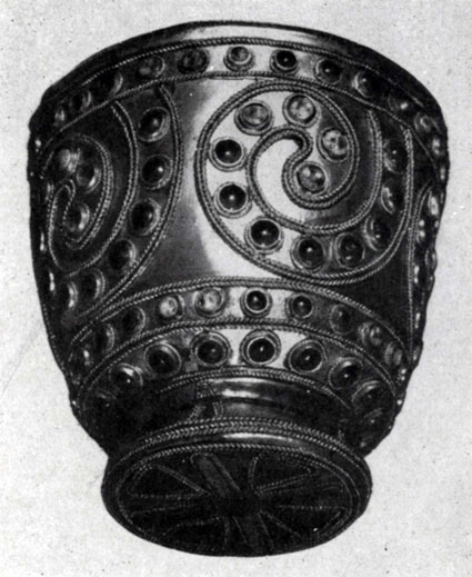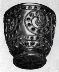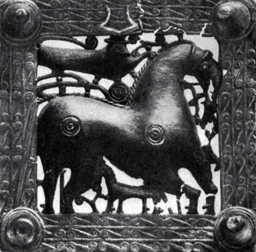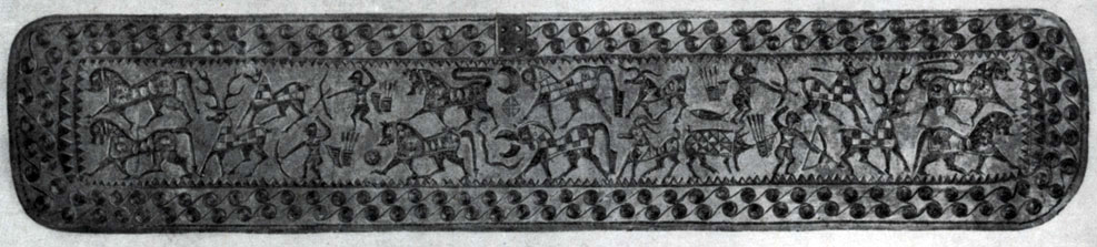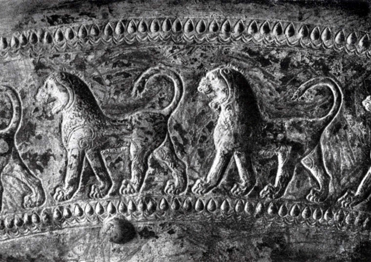 Примером могут служить бронзовые декоративные щиты с Топрах-кала и Кармир-Блура, украшенные несколькими концентрическими полосами с изображениями львов и быков, подобные щитам фасада храма в Мусасире, а также декоративные бронзовые колчаны с Кармир-блура, покрытые тонко выполненными чеканными и гравированными изображениями всадников и боевых колесниц, расположенными в несколько рядов. Эти памятники урартского декоративного искусства свидетельствуют о высоком мастерстве художественной обработки бронзовых изделий. Это подтверждают также и обнаруженные на Кармир-блуре бронзовые шлемы с тонкими чеканными изображениями и посвятительными надписями урартских царей Аргишти I и Сардури II(8 в. до н.э.). На лобной части шлемов помещены три ряда крылатых и бескрылых божеств ассирийского типа, стоящих перед стелами с изображением священпых деревьев. Эти композиции обрамлены фигурами змееобразных драконов с львиными головами. Затылочная и височные части украшены двумя рядами изображений всадников и боевых колесниц. Мастера, изготовлявшие и украшавшие эти шлемы, стремились точно изобразить одежды воинов, тщательно передать характер конской упряжки, детали различных предметов. Однако в трактовке изображении художники были скованы сложившейся традицией, отойти от которой они не могли, Поэтому в неизменно повторяющихся позах показаны и стоящие божества, и скачущие всадники, и мчащиеся колесницы, а сами шлемы, выполненные в разное время и разными мастерами, так похожи один на другой.