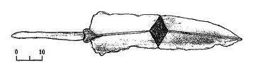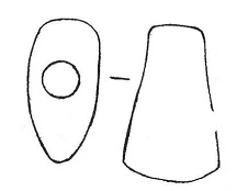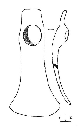 აღნიშნულ, მნიშვნელოვანი ინფორმაციის მქონე ნივთიერი მასალიდან განსაკუთრებით აღსანიშნავია ყუახვრელიანი ქვის საბრძოლო ცული, რომელსაც ფართოდ მომრგვალებული ყუა და ტანის ზედა ნაწილში დატანილი მრგვალი სატარე ხვრელი აქვს. სწორი ტანი პირისკენ თანდათან ფართოვდება და სამკუთხა ფორმას იძენს (სიგრძე – 9 სმ., სიფართე ყუის მხარეზე – 3,5 სმ., სიფართე პირის მხარეზე – 5 სმ., სატარე ნახვრეტის დიამეტრი – 2X2 სმ, მანძილი სატარე ნახვრეტის კიდიდან გვერდამდე – 1 სმ.). ტექნოლოგიურად როგორც ცალმხრივი, ისე ორმხრივი ხეხვით ძალიან მაღალ დონეზე შესრულებულ, ხის სახელურის ხანგრძლივი დაგების შედეგად გაპრიალებულ, მრგვალ სატარე ხვრელში ხრახნისებური ნაწიბურები შეინიშნება. ზედაპირნაპრიალები ცული მკვრივი ქანის ქვისაგანაა დამზადებული. ცულის ყუა, პირი და სატარე ხვრელის უკანა მხარის გარეპირი დაზიანებულია.