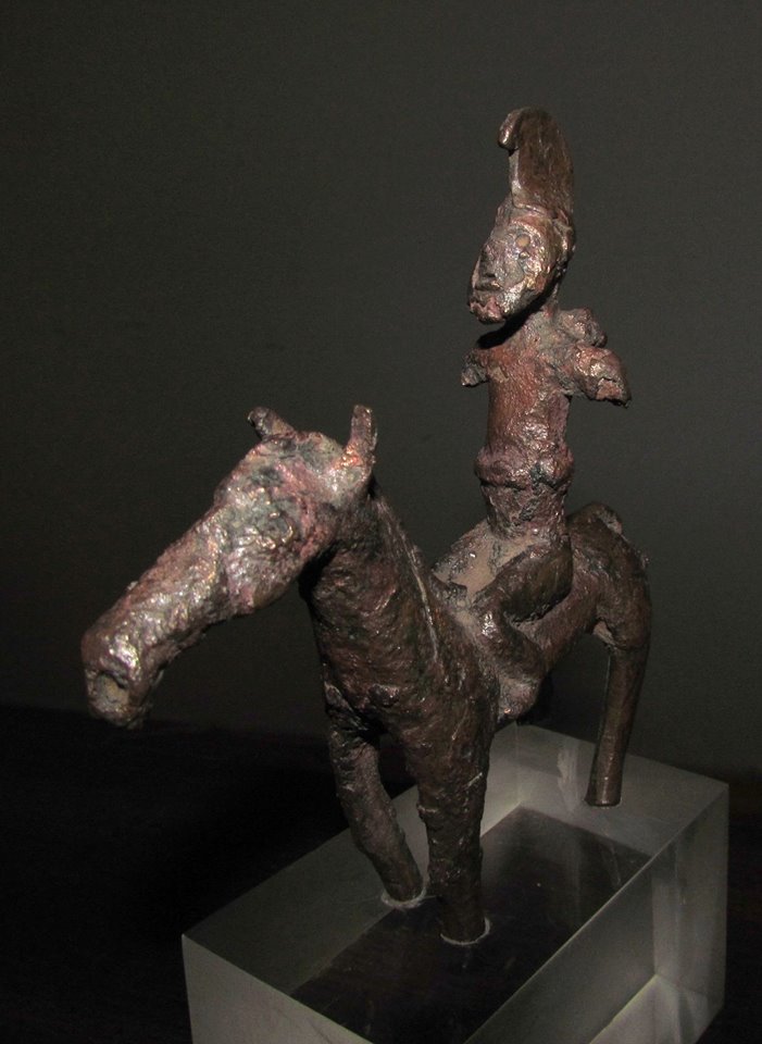 „ბრინჯაოს მხედრის თავსაბურის ფორმა ერთი შეხედვით, მოგვაგონებს კლასიკური პერიოდის ხეთური ხელოვნებისათვის ტიპიური მხედრების მუზარადს, უფრო გულდასმით დაკვირვება გვაიძულებს დავასკვნათ, რომ ეს ქუდი უახლოვდება ე.წ ფრიგიულ თავსაბურავს, რომელიც კარგადაა ცნობილი ნემრუდ - დაღის რელიეფზე და სკვითურ - ირანულ ხელოვნებაში. ელინისტურ რომაულ ხელოვნებაში ეს თავსაბურავი წარმოადგენს ღვთაება მითრას აუცილებელ ატრიბუტს.