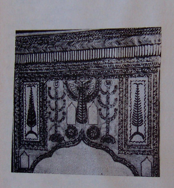 აღნიშნულ ბუხრის თაროზე ძირითადად გეომეტრიულ ორნამენტს ენიჭება უპირატესობა, ხოლო კამარაზე ვხვდებით როგორც გეომეტრიულ, ასევე მცენარეულ ორნამენტებს. კამარის ცენტრალურ ადგილს იკავებს სიცოცხლის ხის გამოსახულება. მას ორივე მხარეს სიცოცხლის ხის კიდევ ორ-ორი გამოსახულება უდგას. როგორც ცნობილია, სიცოცხლის ხე სხვადასხვა ჯიშის ხეებითაა წარმოდგენილი, ამ შემთხვევაში ეს უკანასკნელი ალვის ხის სახით წარმოგვიდგება. ხეს წვერში ჯიხვის რქები ადგას.