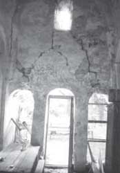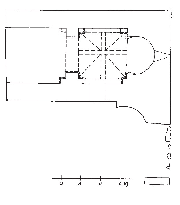 ადრინდელი ტაძარი ინტერიერის მხრიდან თლილი, ხოლო ფასადები (კუთხეთა გამოკლებით) თანაბარი უთლელი ქვითაა ნაშენი. ამ ტაძრის აღმოსავლეთით მონალისებრო აფსიდით დასრულებული ძირითადი სივრცე ჯვრული კამარით გვირგვინდება (!), რომელიც დასავლეთისკენ თლილი ნახევარწრიული კამარით გრძელდება, კამარით, რომელიც კედლებით ოთხმხრივ არ იკვრებოდა და დასავლეთი მხრიდან ღია უნდა ყოფილიყო – სულ ახლახან აქ ჩატარებულმა გათხრებმა დასავლეთი კედლის მიწისქვეშა სარჩული – მოქანდაკების ზოლი გამოავლინა; ეს ზოლი სიმბოლური ზღვარი, მშენებლობისას დასავლეთი გაბარიტის მომსაზღვრული ჩანს – მასზე კედლის ქვების წყობის არც ერთი (!) ქვა არ დაფიქსირებულა, მაშინ როცა ასეთივე სარჩულზე სხვა სამი კედელი, როგორც ითქვა, დღემდე მთელი სიმაღლითაა შემონახული. უფრო მეტიც, ეკლესიის სამხრეთი, პილასტრებსშორისი კედელი უსწორო რიგებითაა ამოყვანილი, ამ კედელში მოყოლილი პილასტრების სუფთად თლილი, გარე პირი კი ცხადყოფს, რომ იგი ფასადზე გადიოდა, მისი დამფარავი კედელი კი მერმინდელია და ე.ი. თავდაპირველად ეკლესია სამხრეთიდანაც თაღით იყო გახსნილი.