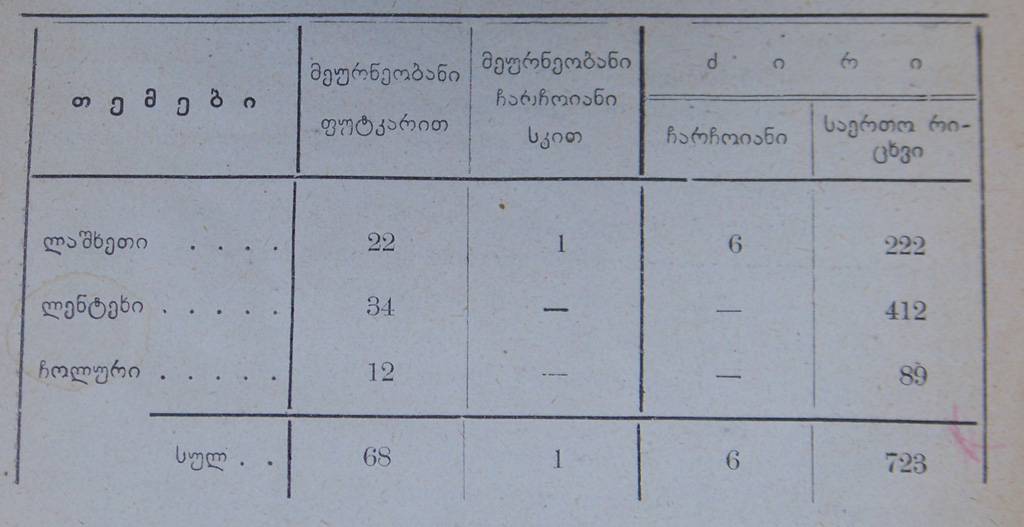 სტატისტიკური ცნობები ქვემო სვანეთის მეფუტკრეობის შესახებ შემდეგნაირია: