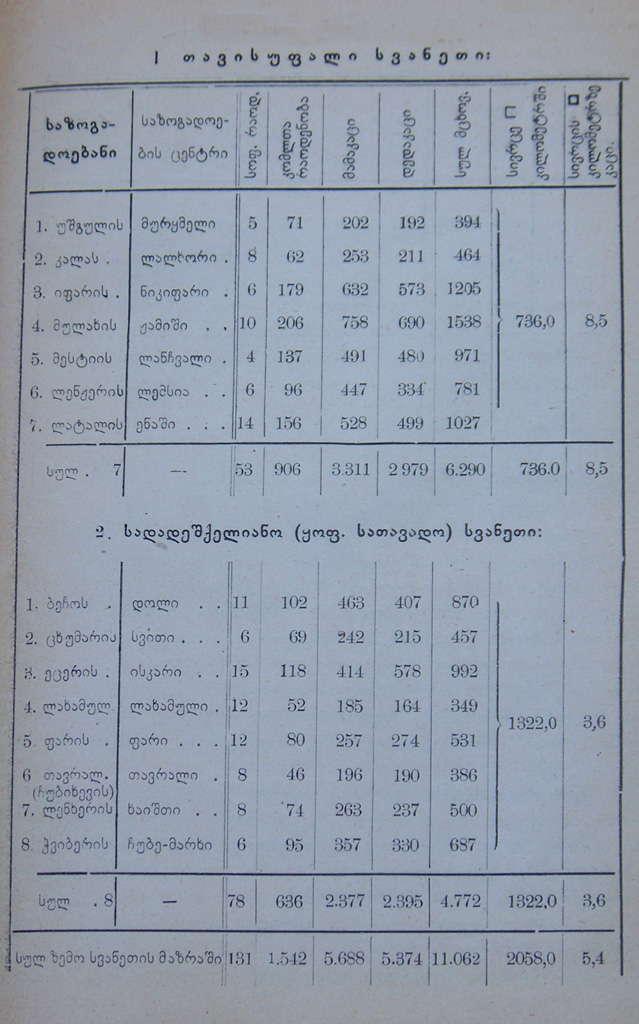 ცხრილიდან ჩანს, რომ ნამეტან მჭიდროთ არის დასახლებული თავისუფალი სვანეთი, რაცა ერთ ოთხკუთხ კილომეტრზე მოდის 8,5 კაცი; მას მისდევს ქვემო სვანეთი (5,6 კაცი კილომეტრზე) და სუყველაზე ნაკლებად დასახლებულია სადადეშქელიანო სვანეთი (3,6 კაცი 1 კილომეტრზე).