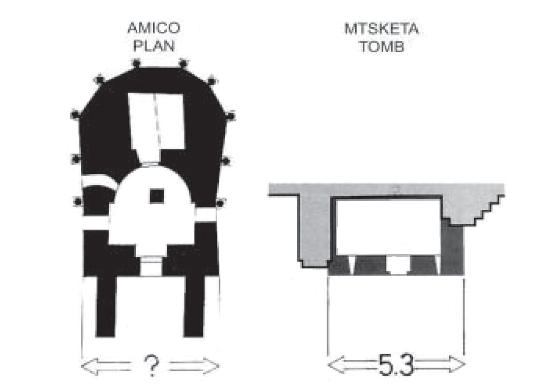 მაგრამ ამიკოს მცირე გეგმა ზომით წმ. საფლავის ცალკე გეგმის ერთი მეშვიდედია. ის მეორე, ფლორენციულ გამოცემაშია გამოქვეყნებული და, ამიტომაც, მას მეტის მეტი მნიშვნელობა არ უნდა მივცეთ. მაგრამ მოზრდილი გამოსახულების მონაცემებსაც შემტკიცება უნდა და ჩვენ გვაქვს მის შესამაგრებლად მომლოცველთა ერთმანეთისგან დამოუკიდებელი ცნობები - რიტერი (1479წ.) ამბობს, სიგანე 5.18 მ.-აო, ხოლო ჰორნის (1730 წ-ს ახლოს) თქმით 5.08.21 ამრიგად, ამიკოს პირველი გამოცემის მოზრდილი გამოსახულება მეორე გამოცემაზე სანდო უნდა იყოს. აქედან შეგვიძლია დავასკვნათ, რომ მცხეთური “ასლის” სიგანეც - 5,03 მ. იერუსალიმური ნიმუშის მიბაძვის მცდელობაზე მიგვითითებს.