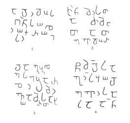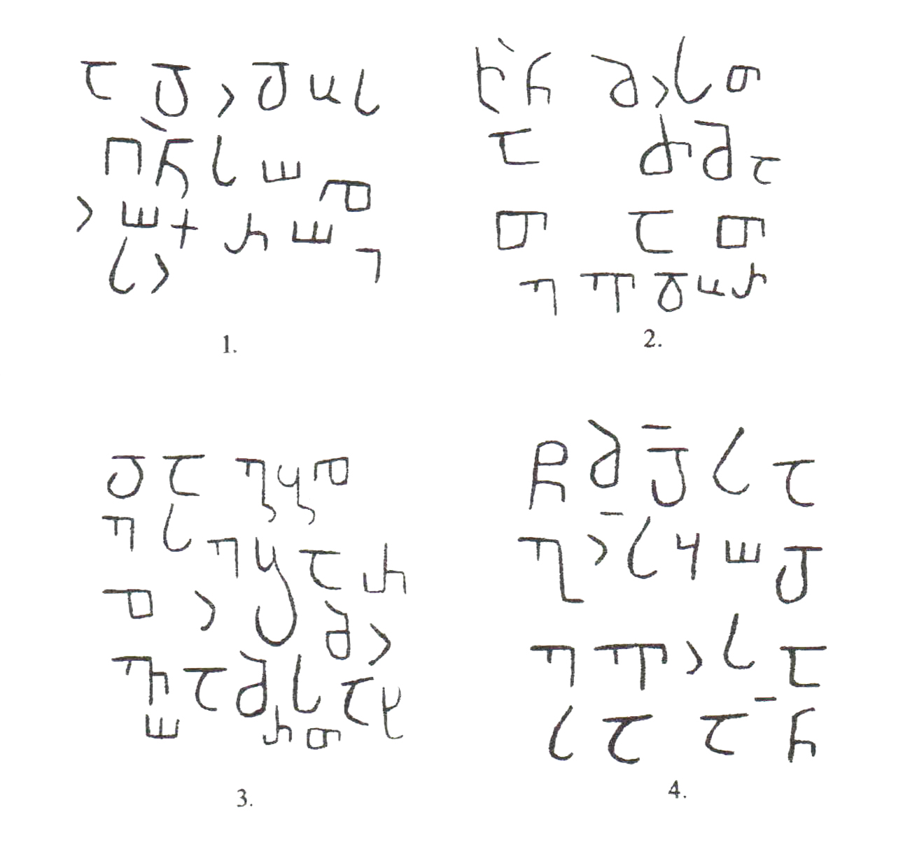 წარწერაში ქარაგმის ნიშანი მოკლე სწორი ხაზია და ხუთჯერაა ნახმარი, მიუხედავად იმისა, რომ ასოები სხვაგანაცაა გამოტოვებული. განკვეთილობის ნიშანი არსად არაა, დამწერი სიტყვების დაშორებას ცდილობს, „უ“-ს მაგიერ ყველგან „ო“ წერია. პირველ კვადრატში საკუთარი სახელია ოქრო, რომლის შემდეგ თითქოს ასომთავრული „ი“ ჩანს, შემდეგ კი „სი“, ე.ი. „ოქროისი“; მაგრამ წარწერაში 8-ჯერ ნახმარი „ი“ - სრულიად სხვაგვარადაა ამოჭრილი, ამიტომ შესაძლოა აქ დაზიანებული „პ“ გვქონდეს და მაშინ ეს სიტყვა უნდა წაგვეკითხა, როგორც „ოქროპირისი“. ერთზე მეტი ასოს გამოტოვება საკუთარ სახელში აქ სხვაგანაც გვაქვს - გბლ, გი.