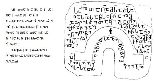 წარწერაში სწორი ნუსხურით გადმოცემულია მხოლოდ ორი გრაფემა: “ლასი” და “თანი”. წარწერაში “ლასი” შვიდჯერ გვხვდება, მისთვის დამახასიათებელია მარცხნივ გაზიდული დამატებითი განივი ხაზი. “თანი” ტექსტში დადასტურებულია რვაჯერ, გადმოცემულია კუთხოვანი ფორმით, თუმცა ზოგ შემთხვევაში შეინიშნება კუთხეების მომრგვალების ტენდენცია (მესამე სტრიქონის პირველ სიტყვაში).