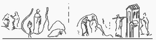 [4] ამის შემდგომ ფერწერული ციკლის სცენათა რიგი დარბაზის ჩრდილოეთ კედელზე გრძელდება. კედლის დასავლეთ კუთხეში, როგორც აღინიშნა, ფერწერა მთლიანადაა წარხოცილი, თუმცა კი შემორჩა მთიანი ლანდშაფტის აღმნიშვნელი მკრთალი კონტურების ნაშთები კედლის ზედა ნაწილში. საგულისხმოა ისიც, რომ ციკლის მომდევნო სცენა დარბაზის ჩრდილო-დასავლეთი კუთხიდან დაახლოებით 130 სმ დაშორებით იწყება (მიახლოებითი ზომა განპირობებულია იმით, რომ კუთხე არასწორი მოხაზულობისაა). ამგვარი რამ შედარებით უჩვეულოდ ჩანს იმ უწყვეტობის ფონზე, რომელიც აქ არის; მით უფრო, რომ ზემოთ მთაგრეხილი გრძელდება. არანაკლებ მნიშვნელოვანია ისიც, რომ ამ მონაკვეთზე, მომდევნო სცენასა და კედლის კუთხეს შორის მოჩანს დიაგონალურად დახრილი ორი