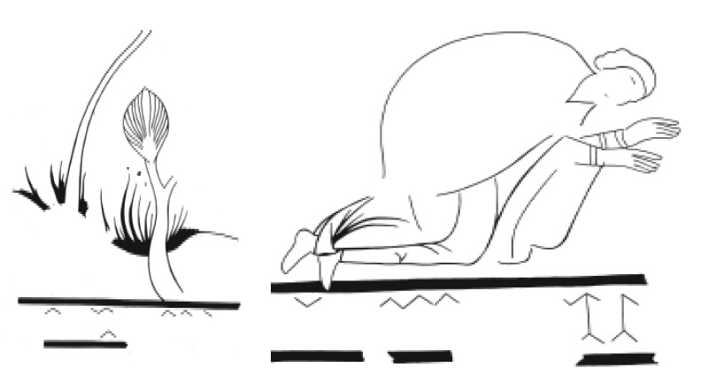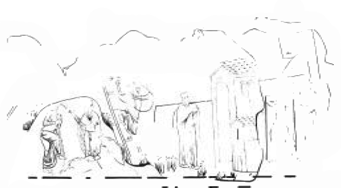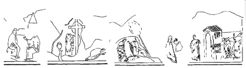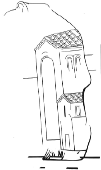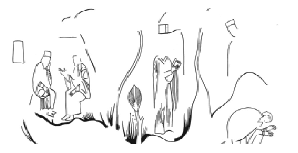 პარალელური ზოლის მოზრდილი ფრაგმენტი (იგი გ. აბრამიშვილის სქემაზეცაა აღნიშნული – შდრ. სურ. 2). ყოველივე ამის გათვალისწინებით გამორიცხული არ არის, რომ დარბაზის კედლის ამ მონაკვეთზე კიდევ ერთი, რიგით მეოთხე ეპიზოდი უნდა ყოფილიყო გამოსახული.