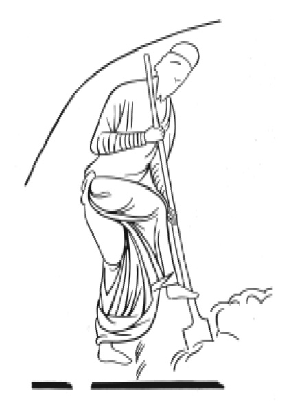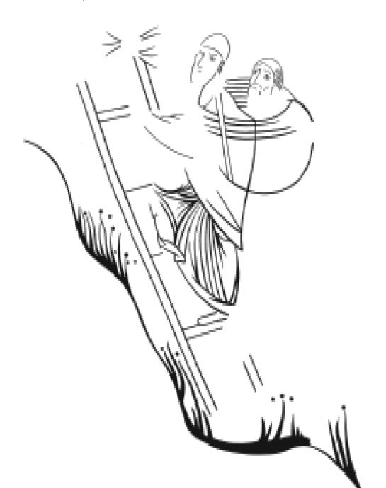გრაფიკული ასლის გადმოღებისას გაირკვა, რომ ბორცვის მარჯვნივ გამოსახულია დიაგონალურად დახრილი მაღალი კიბე. მასზე ადის ბერი, რომელსაც ზურგზე მოკიდებული წნული კალათით მოწესე აჰყავს (ფრესკაზე მოჩანს კალათის სამაგრი ღვედი, რომელიც გ. აბრამიშვილისეულ სქემაზე წმ. დავითის კვერთხად არის წარმოდგენილი). პირველი ფიგურა საბერო ჩოÃითაა მოსილი, კუნკულიც (ნახევარსფერული ფორმისა) მხოლოდ მას ჰხურავს; მეორე ბერი თავშიშველია, შუბლზე ორად გაყოფილი გრძელი ტალღურად დაფენილი თმებით. ემოციური გამომსახველობის თვალსაზრისით შეუძლებელია ყურადღება არ მიიქციოს მოწესეთა სახეებმა – ორივე მათგანი სიმკაცრითა და შინაგანი დრამატიზმითაა აღბეჭდილი. კიბის თავზე სხივებად გამავალ ხაზთა კონა თითქოსდა მნათობის ბრწყინვალებას უნდა გადმოსცემდეს.