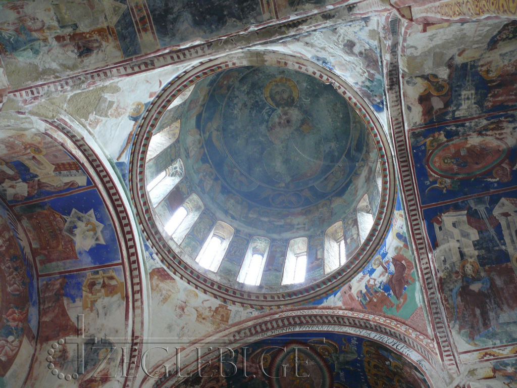 გუმბათის მხატვრობის იდეური და მხატვრული ცენტრი, მის სფეროში მთელი ტანით გამოსახული ქრისტე პანტოკრატორის უზარმაზარი ფიგურაა. იგი თავისი კონფიგურაციით მიანიშნებს დასავლეთ-აღმოსავლეთის ღერძს, რომელიც აქცენტირებულია ფიგურის შემომსაზღვრელ ვიწრო სარტყელში განლაგებულ ტეტრამორფთა და ევანგელისტთა სიმბოლური გამოსახულებებით. გუმბათის სფეროს მეორე, უფრო ფართო სარტყელში წარმოდგენილ “საღმრთო ლიტურგიის” კომპოზიციაში ანგელოზები დასავლეთიდან აღმოსავლეთის მიმართულებით მიასვენებენ გარდაცვლილ ქრისტეს. აღმოსავლეთით ანგელოზთა გუნდით გარშემორტყმული ქრისტეს ფიგურაა კიბორიუმთან, საპირისპირო მხარეს, დასავლეთით კი გარდაცვლილი ქრისტეა. დასავლეთ-აღმოსავლეთის მიმართულება მინიშნებულია აგრეთვე გუმბათის ყელის სარკმლებს შორის განლაგებულ წინასწარმეტყველთა გამოსახულებებშიც. დასავლეთით სამ მეოთხედში წარმოდგენილი ფიგურები აღმოსავლეთისკენ არიან ორიენტირებული, სადაც მათ ენაცვლებათ ფრონტალური გამოსახულებანი.
