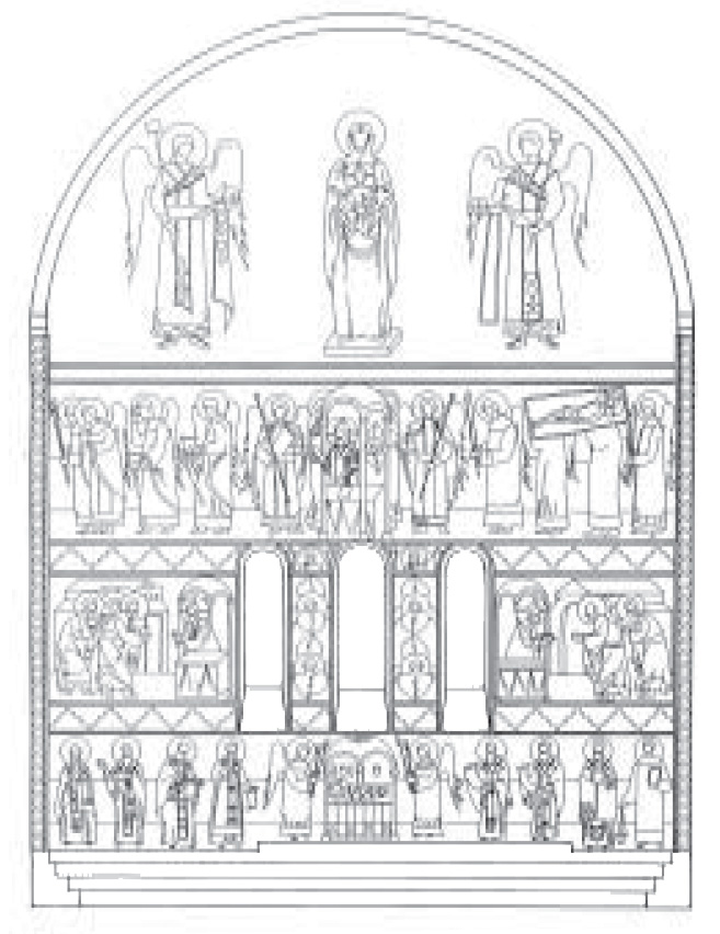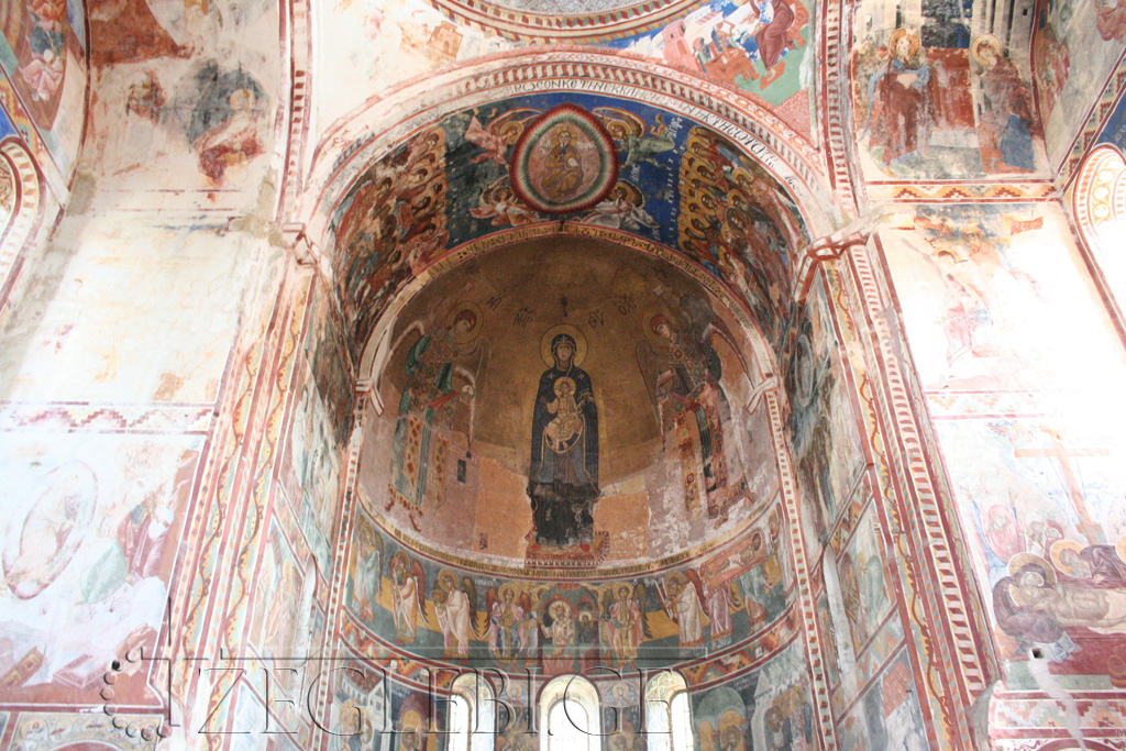 საკურთხევლის აფსიდის იკონოგრაფიულ პროგრამაში ტრადიციულ კომპოზიციებს (ღმრთისმშობელი მთავარანგელოზთა შორის, “მოციქულთა ზიარება”, “მსხვერპლის თაყვანისცემა”) ემატება ბიზანტიური წრის ძეგლებში XIV საუკუნიდან გავრცელებული “საღმრთო ლიტურგია”, ამიტომ რეგისტრთა რაოდენობა გაზრდილია - ოთხია.