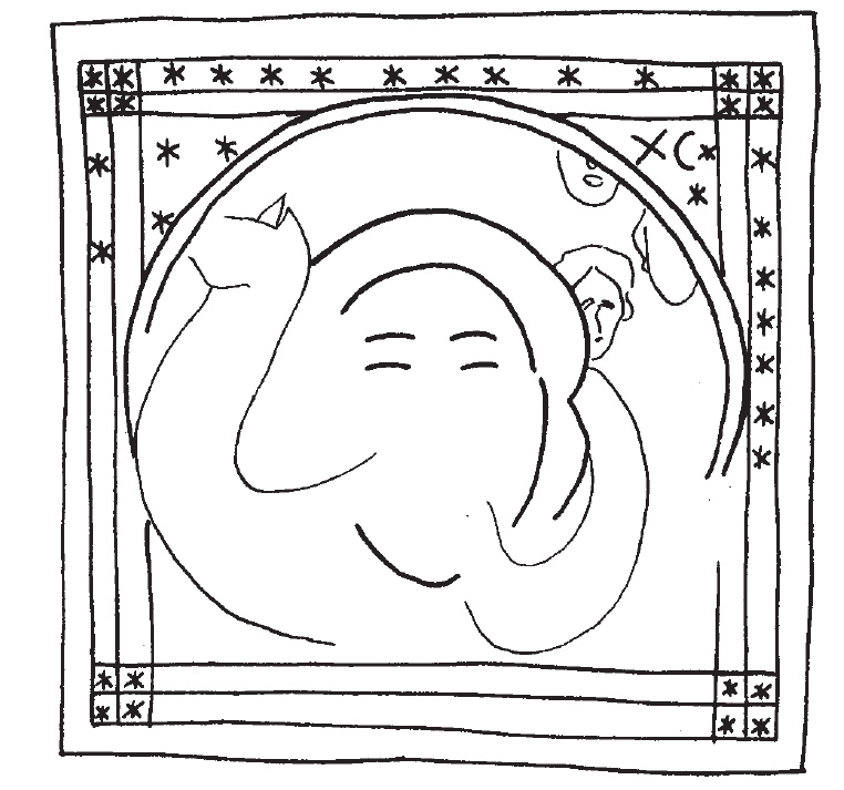 როგორც ჩანს, ბათქაშის უქონლობამ განსაზღვრა ამ შედარებით მოგვიანო მოხატულობის ნაწილობრივი ჩამოცვენა, რის შედეგადაც პირველი, ქვედა ფენის მხატვრობაც გამოჩნდა. ამჟამად მაყურებელს ორი ერთმანეთზე დადებული კომპოზიცია წარმოუდგება, მაგრამ დაკვირვებისას მანდილიონის ნაწილობრივ ამოკითხვა მაინც არის შესაძლებელი და მის ზოგად ხაზებში წარმოსახვაც ხერხდება. (ნახ. 3) განსაკუთრებით კარგად არის შემორჩენილი მანდილი _ თეთრი, უნაოჭო, გაშლილი ტილო სინგურით დატანილი ვარსკვლავების გამოსახულებებით. ტილოს მოჩარჩოებას უქმნის სამი პარალელური კონტური (გარე_სინგური, შუა შავი), რომელიც გადაკვეთაზე ოთხ სეგმენტად დაყოფილ მართკუთხედებს იძლევა. ყოველ სეგმენტში ვარსკვლავების გამოსახულებებია ჩაწერილი. ამ მოჩარჩოებას, თავის მხრივ, ინტენსიური სინგურის საკმაოდ მსხვილი სარტყელი დაუყვება, რომელიც ერთიანად კრავს გამოსახულებას და ხატის სახეს ანიჭებს მას. ეს გამოყოფა გამოსახულებისა საერთო ფონიდან მით უფრო თვალსაჩინოა, რომ დასავლეთ მკლავში გამოსახული საშინელი სამსჯავროს კომპოზიციებს მხოლოდ რეგისტრების აღმნიშვნელი ჰორიზონტალური ზოლი ანაწევრებს, რის გამოც დასავლეთი მკლავის ქვესკნელის ამსახველი სცენები ხალიჩისებრ ეფინება კედელს და ერთიანად, ერთი თვალის შევლებით იკითხება (თითქოს მხატვარს თვალის შეჩერება არ სურსო).