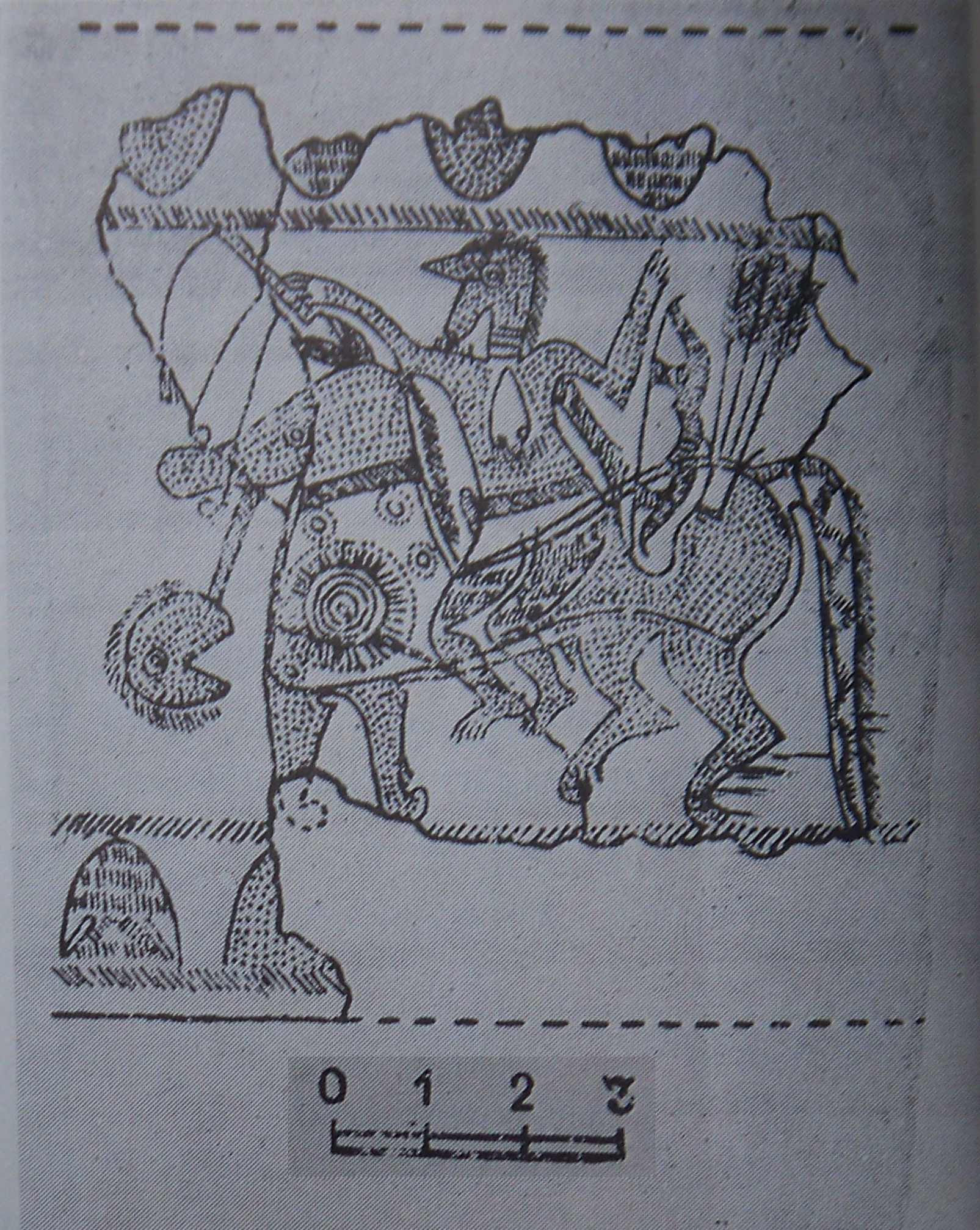 ი. სმირნოვის სიტყვებით: „ცხენოსანთა ყველაზე საინტერესო გამოხატულებანი მოთავსებულია ჯიხვების თავებზე... მხედრის ორივე ხელი წაწვდილია წინ ცხენის სადავეებთან; მაგრამ ცხენის გახრილი წყვილი რქა საეჭვოდ ხდის განსაზღვრას, იმ ცხოველისა, რომელზეც ზის მხედარი: მაინც ყველაზე საეგებისო იქნება, ვგონებ, ის მივიჩნიოთ ფანტასტიკურ რქოსან ცხენად, ვიდრე ჯიხვად, თხად, ან სხვა“.