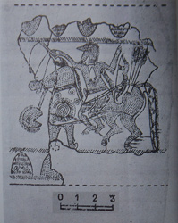 ეს განზრახვა, რომ მხედარი ზის რქოსან ცხენზე, დადასტურდა შემდეგში, წინა წყაროსთან ნაპოვნი საბეჭდავი - ბეჭდის საშვალებით, მასზე მკაფიოდ გამოხატულია მხედარი რქოსან ცხენზე.