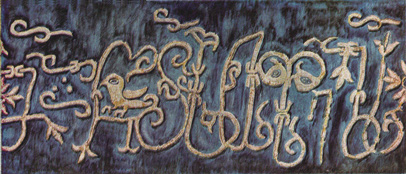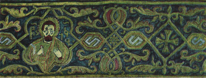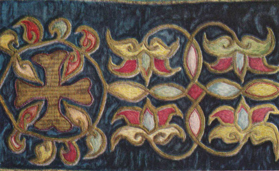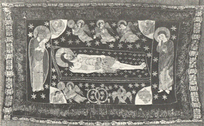 კუთხეებში მოთავსებული ოთხი მახარობლის ემბლემა, როგორც შინაარსობრივად, ისე კომპოზიციურად მიქცეულია კომპოზიციის მთავარი პერსონაჟისაკენ, რაც ხელს უწყობს მაყურებლის ყურადღების გამახვილებას ცენრალურ ფიგურაზე. მთელი სურათი შეკრულია ჯვრებისა და წმინდანებისაგან შემდგარი ფართო ორნამენტურლი არშიით. მქარგველი ერთ სურათად წარმოგვიდგენს ქრისტეს ცხოვრების ჯვრიდან ჩამოხსნის შემდგომ ეპიზოდს. ქრისტეს ცხედარს დედა და მახლობლები დასტირიან, ამით ხელოვანს უნდა მთელი მომენტის დრამატიზმის აღნიშვნა, მაგრამ, როგორც საზეიმო საღმრთო მსახურების შემსრულებელი, იგი ცდილობს მწუხარების განწყობა შეანელოს. ეს ხაზგასმულია მოვლენათა მსვლელობის შემდგომ ეპიზოდებშიც. ავტორს არ უნდა, რომ გარდაცვლილი ქრისტეს ტირილის ძირითადი მომენტი გახადოს ხანგრძლივი შთაბეჭდილების საგანად და მაყურებლის აზრი გადააქვს ჯერ ქვაზე, რომლის ქვეშ მაცხოვარი იყო დაკრძალული და შემდეგ სამარეზე, საიდანაც ქრისტე აღსდგა. ამრიგად, აქვე ხაზგასმულია ქრისტეს ხანმოკლე სიკვდილი, რომ იგი მოკვდა, მაგრამ აღსდგება და აღსდგა კიდეც. ამიტომ შეიძლება მხატვარმა ქვემო რეგისტრის ზოგიერთი პერსონაჟი მოჭარბებული ზომისაც კი მოგვცა, რათა მკვდარი ქრისტესაგან მაყურებლის თვალი სწრაფად გადასულიყო იმ სურათებზე, რომელნიც მის უხრწნელობასა და აღდგომას ამცნებს, ბოლოს, ზემოთ მოთავსებული ამაღლება ამ აზრს აგვირგვინებს.