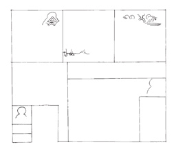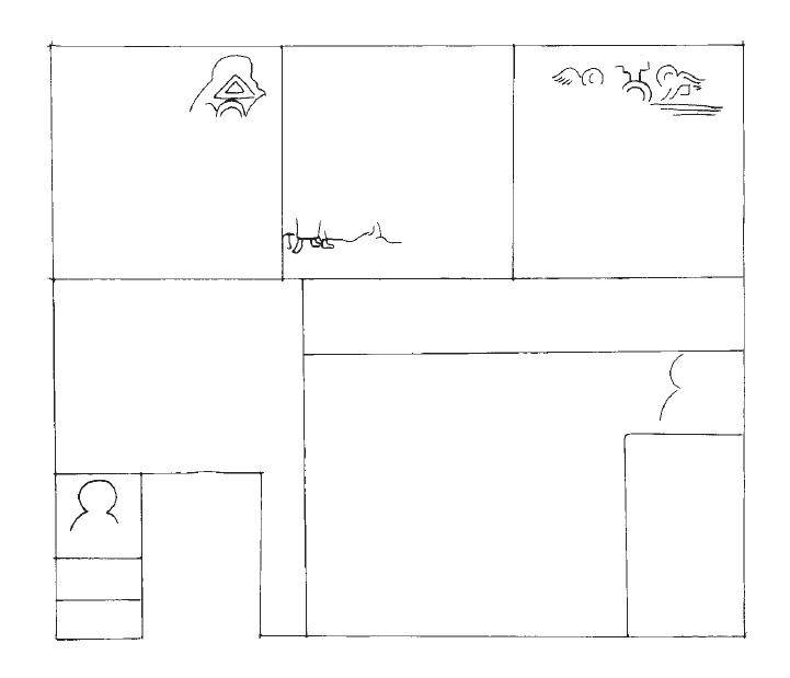 გეომეტრიული ორნამენტის ფართო სარტყელი, მოტივების მცირე ვარიაციებით, იატაკის დონიდან იწყება. განსხვავებული ზომის რეგისტრებად განაწილებულ კომპოზიციებს კი ყველგან ვიწრო, მოწითალო-ყავისფერი ტიხრები ჰყოფს.