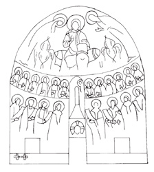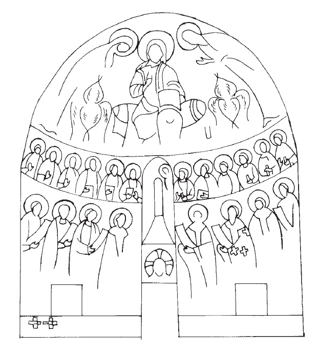 შესაბამისად, ეკლესიის მამათა პროცესიის _ ღმრთისმსახურების რიტუალის გამოსახულება საშუალებას იძლეოდა საკულტო სინამდვილის, ლიტურგიის მუდმივად და დაუსრულებლად გაგრძელებისა ეკლესიის სივრცეში, მაშინაც კი, როდესაც ტაძარში ღვთისმსახურება რეალურად არ მიმდინარეობდა. “ვედრებისაგან~ განსხვავებით ეს კომპოზიცია, ერთი მხრივ, ლიტურგიის მიწიერი ფორმის გამოხატულებაა, რადგან ეკლესიის ისტორიის ნაწილს ასახავს. აქ წარმოდგენილი წმინდანები, ხომ ისტორიული პირები არიან და მათი ცხოვრების აღწერილობანი თუ ნააზრევი დღესაც ცნობილი და ხელმისაწვდომია. მეორე მხრივ _ რადგან ეს ფიგურები ქვედა ზონაში, მაყურებლის თვალწინ გამოისახებიან, თითქოს რეალურად მიმდინარე ჟამისწირვის მონაწილეებად აღიქმებიან მორწმუნეთა მიერ ანუ მათი რიტუალი რეალური ღვთისმსახურების დასაბამი და წინასახეა და, ამავე დროს, კონქის ციურ-ზედროული ლიტურგიის ანარეკლიც.