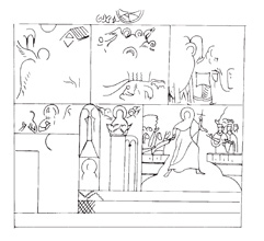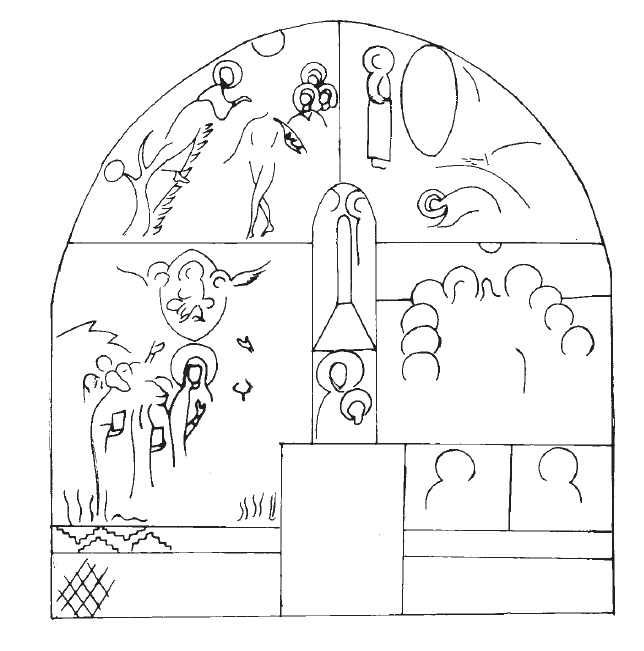 ფართოდ გაშლილი საკურთხეველი დაყოფილია სამ რეგისტრად _ კონქში “ვედრება~, მის ქვემოთ მკერდამდე გამოსახულ მოციქულთა ლიტურგიკული მწკრივი, დასასრულ კი ეკლესიის მამათა პროცესია, რომლებიც “ხატი მანდილისაის~ გამოსახულებას სცემენ თაყვანს (სურ. 1)*. დარბაზის კედლებს მოხატულობა ძირითადად ორ რეგისტრად ჰყოფს. ისტორიული თანმიმდევრობით დაჯგუფებული ათორმეტ დღესასწაულთა ციკლი წრიული მოძრაობით ზემოდან ქვემოთ ვითარდება.