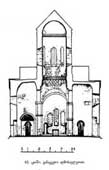 ტაძრის ძირითადი შიდა სივრცე შექმნილია ჯვრის ფორმის გეგმაზე აღმართული მასებითა და ცენტრალური გუმბათით. ამ ჯვრის ჩრდილო და სამხრეთის სწორკუთხა მკლავები მოკლეა, ხოლო დასავლეთისა და აღმოსავლეთის – დაგრძელებული. აღმოსავლეთის მკლავი მთავრდება საკურთხევლის აფსიდით. საკურთხევლის გეგმა მთლიანად უწესოა, ასევე არაწესიერ გეგმაზეა აგებული ბემაც. აფსიდის და ბემის არაწესიერი ფორმა და აფსიდის კედლის სისქის განსხვავება დანარჩენი კედლებისაგან გვიკარნახებს, რომ აქ გადაკეთებასთან გვაქვს საქმე. საკურთხეველი გვერდიგვერდ, საკმაოდ მჭიდროდ განლაგებული სამი სარკმლიდან შემოსული შუქით ნათდება. როგორც მთელი აფსიდი კონქით, ისე ბემაც კარგად თლილი კვადრებითაა ამოყვანილი, სადაც ნალესობა ჩამოცვენილია, ძალიან წესიერი წყობა ჩანს. საკურთხევლის გვერდით ოთახები, სადიაკვნე და სამკვეთლო, გეგმით თითქმის კვადრატია. ისინი გადახურულია გარე კედლებზე დაყრდნობილი კამარებით. ამ სადგომებს ანათებს აღმოსავლეთის კედელში გაჭრილი თითო სარკმელი. სამკვეთლოში სარკმელზე მიდგმულია ერთი ახალი ტრაპეზე, სადიაკვნეში კი – ორი. აღსანიშნავია გუმბათქვეშა მასიური პილონები (200X210 სმ), რომელთა წიბოები 450-ითაა ჩამოჭრილი და შემოსილია თლილი ქვით. ამ პილონებზე გადასული თაღით გუმბათქვეშა სივრცეს უერთდება ორსართულიანი დასავლეთის მკლავი; ზედა სართულში პატრონიკეა მოთავსებული, ხოლო ქვედა ნაწილი ცილინდრული კამარითაა გადახურული და სამმხრივ ღიადებით უერთდება მომიჯნავე ნაწილებს. პატრონიკე XVII საუკუნის აღდგენის დროსაა აგებული საკმაოდ უმწეოდ. ყველა კედელი დაბრეცილია, გადამხურავი ცილინდრული კამარა ოვალური ფორმისაა, ტალღობრივი ზედაპირით. საიდუმლო ოთახები მოთავსებული ყოფილა საკურთხევლის გვერდითი სადგომების ზემოთ, მეორე სართულზე. აღდგენის შემდეგ ეს ოთახები გამოსულა ხმარებიდან. ამ სადგომებს ერთი საყურადღებო დეტალი აქვთ: მათ აერთიანებს ერთმანეთთან ვიწრო `გვირაბი~ (49X60 სმ), რომელიც იწყება ორივე სადგომის საკურთხევლისაგან გამყოფი კედლიდან და მიჰყვება აფსიდის მომრგვალებას. გვირაბი გადახურულია საკმაოდ ფართო და ბრტყელი ორი კრამიტის ერთმანეთზე მიბჯენით მიღებული სრული კამარით. ამ ხვრელში გასვლა მხოლოდ მუცელზე ხოხვით ხერხდება.