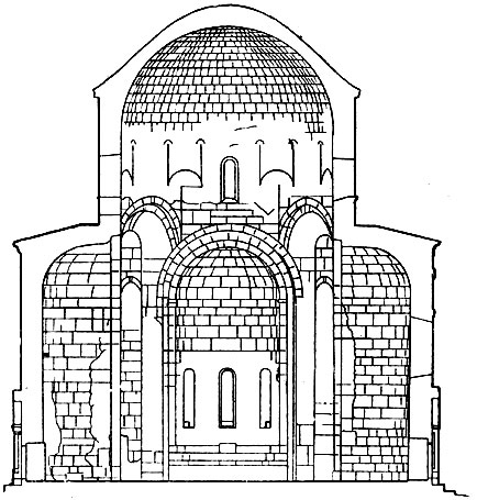 В 11 веке окончательно определился и стал широко применяться своеобразный тип центральнокупольного храма в виде удлиненной с запада на восток четырехугольной постройки, имеющей приподнятую среднюю часть, крестообразную в плане. В центре, опираясь внутри на четыре столба, возвышаются высокий барабан с вертикально прорезанными узкими окнами и коническая кровля купола. Замечательными образцами нового, уже полностью сформировавшегося художественно-архитектурного типа являются знаменитые средневековые грузинские соборы - храм Баграта в Кутаиси (1003), мцхетский Свети-Цховели (1010- 1029, архитектор - Арсукисдзе) и Алавердский кафедральный соборв Кахети (первая половина 11в.).