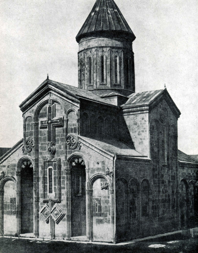 Несравненно лучше кутаисского собора сохранился мцхетский храм Свети-Цховели (Животворящего столба), стоящий почти в центре Мцхеты, на том самом месте, где, по преданию, в 4 в. была построена первая в Грузии христианская церковь. Правда, Этот собор неоднократно подвергался перестройкам и переделкам и к настоящему времени утратил первоначальные приделы на северной и южной сторонах и почти всю фресковую роспись, закрытую побелкой в 19 в. Однако впечатление величавой торжественности сохранилось и в просторном интерьере, где тонкие полуколонны, примыкающие к подкупольным устоям, стремительно вздымаясь ввысь, уводят взгляд к куполу, ярко освещенному светом из шестнадцати окон, и в спокойном ритме постепенно уходящих вверх архитектурных масс.