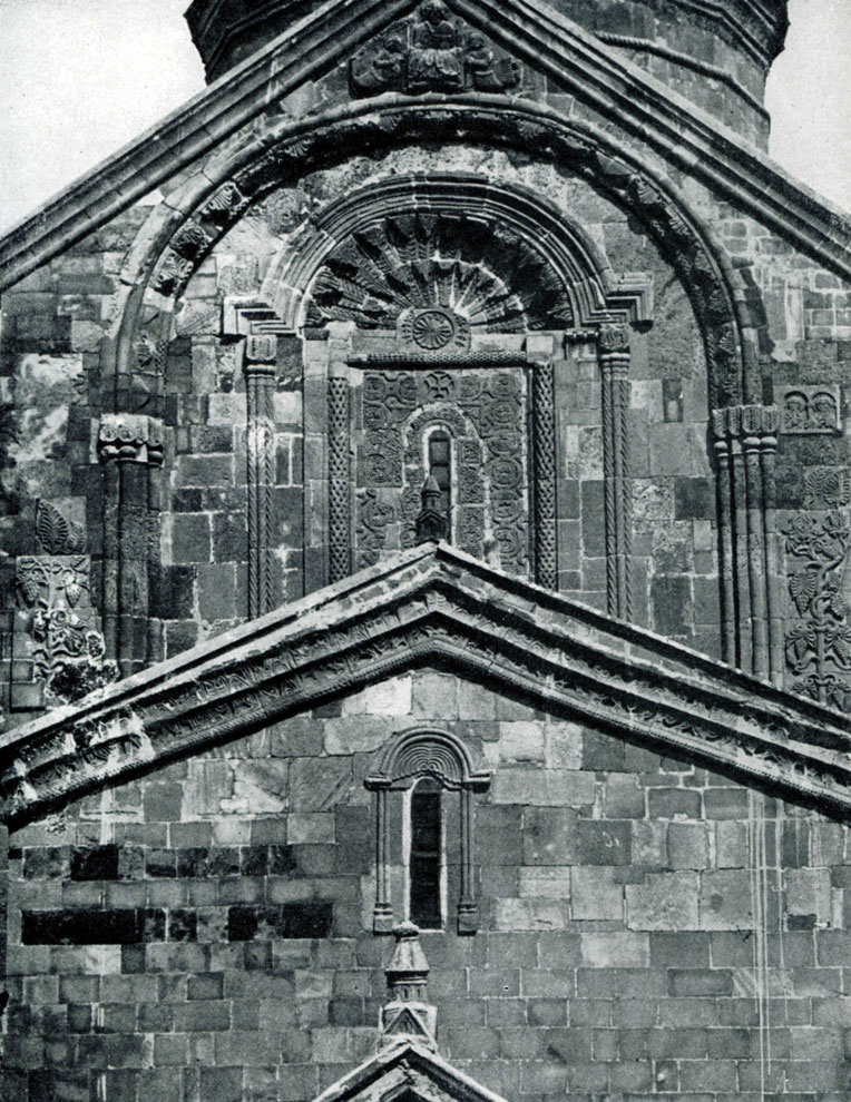 Для внешнего облика храмов 11 в. характерно членение плоскостей стен аркатурой и богатая резная орнаментация на карнизах, наличниках окон и в тимпанах фронтонов. Для украшения храма иногда использовали и полихромный прием - кладку стен из камней различных цветов.