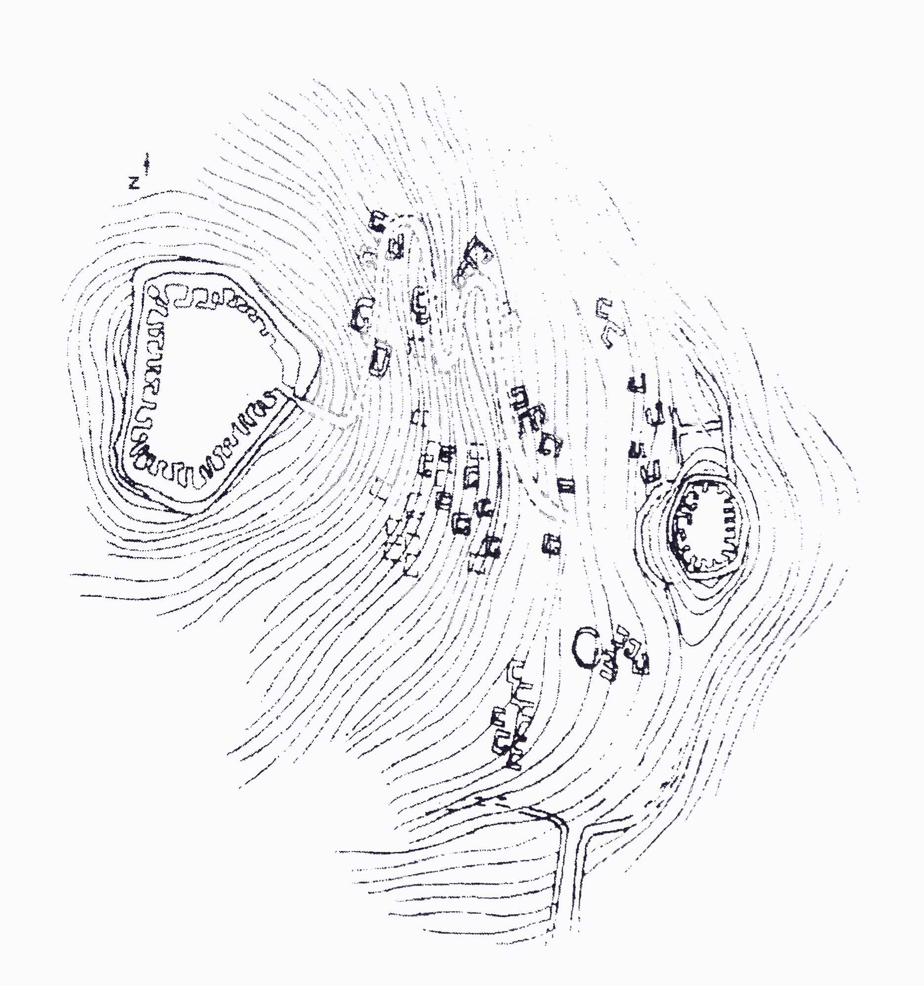 ჩრდილოეთით მყოფ სიმაგრის კედლებს ეტყობა ურარტული მშენებლობის გავლენა: სასიმაგრო კედლების შემაგრება საყრდენებით, კონტრფორსები ყოველ 7 მ-ზე. ნიშა კოშკის კიდეზე. გალავნის შიგნით, ურთიერთდაკავშირებულ ოთახებში აღმოჩნდა აუზი ფართობით 9 მ X 10 მ. ქვედა ფენებში გაითხარა კოლექტიური სამარხი ძვ. 3350-3305 წწ. ე.ი. ურარტული არქიტექტურის ქვეშ უნდა ყოფილიყო მტკვარ-არაქსის კულტურის დასახლება, რომელზედაც გადადის მე-II ათასწლეულის I ნახევრის კულტურული ფენა.