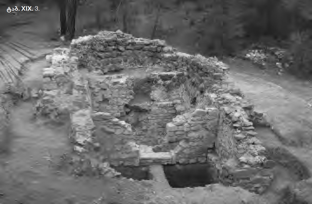 აუზის აფსიდა შუაში გაჭრილია და ამ ღიობში შედის კერამიკული წყალსადენის დასავლეთი ბოლო. აშკარაა, ეს უნდა ყოფილიყო კონქით დახურული წყარო, მიმდებარე წყალშემკრები აუზით. აღმოსავლეთიდან დასავლეთისაკენ მიმართული წყალსადენის კერამიკული მილები კირის დუღაბშია ჩასმული, რაც იმაზე მიუთითებს, რომ წყალი მასში წნევით მიდიოდა.